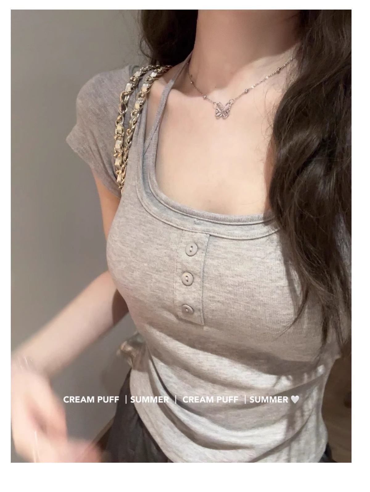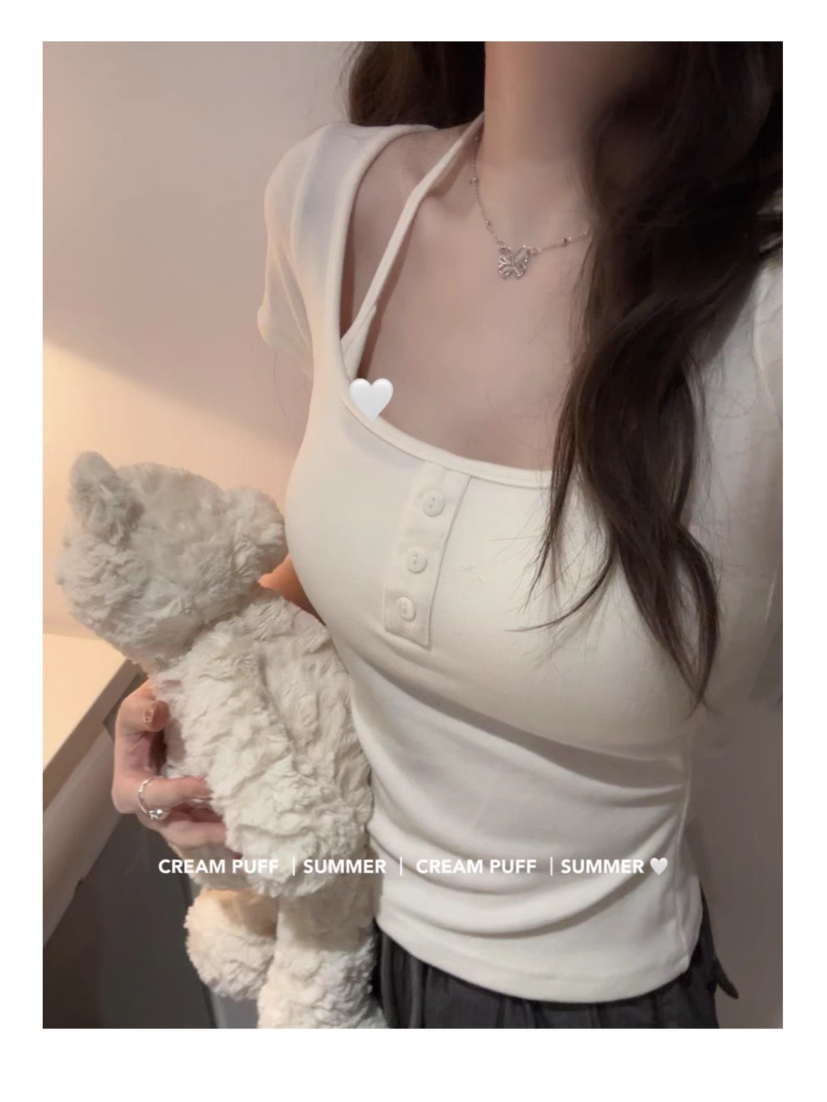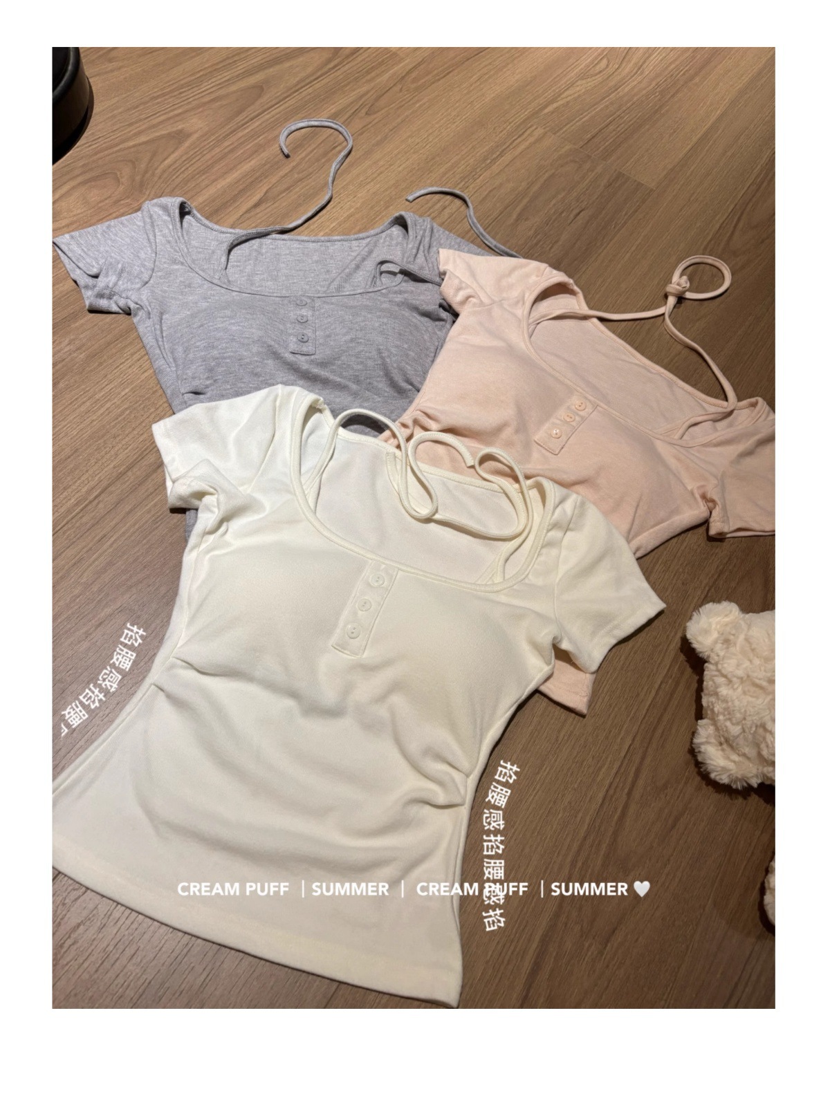 【Чистое желание полное! !】Футболка с короткими рукавами для горячих девушек, облегающий топ из двух частей с воротником-стойкой на шнуровке, с накладками на груди и защипом на талии.