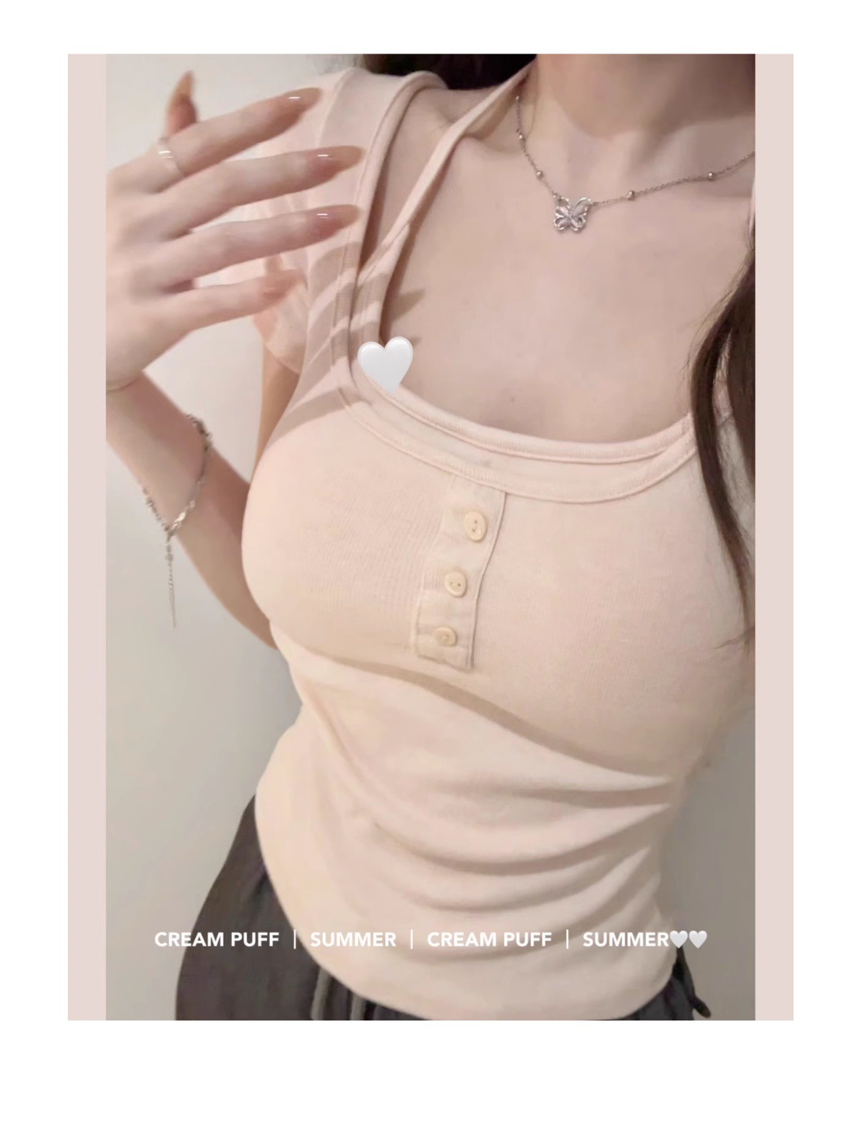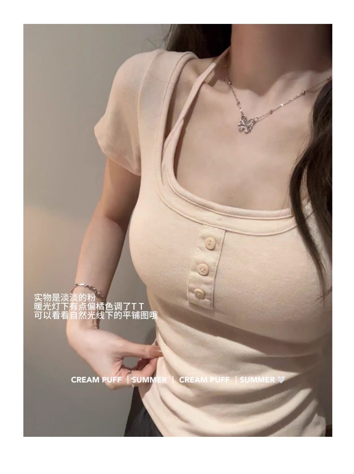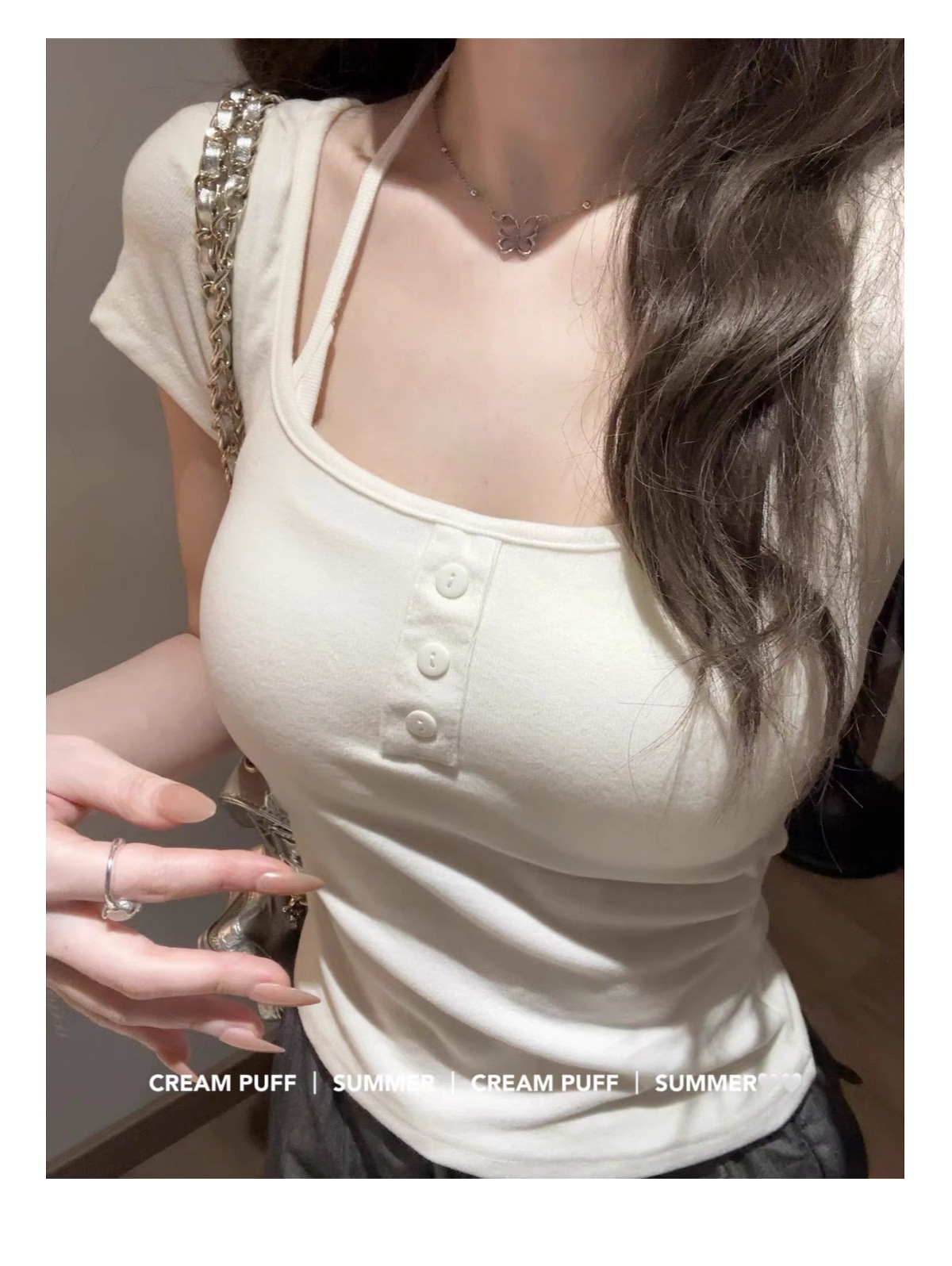 【Чистое желание полное! !】Футболка с короткими рукавами для горячих девушек, облегающий топ из двух частей с воротником-стойкой на шнуровке, с накладками на груди и защипом на талии.
