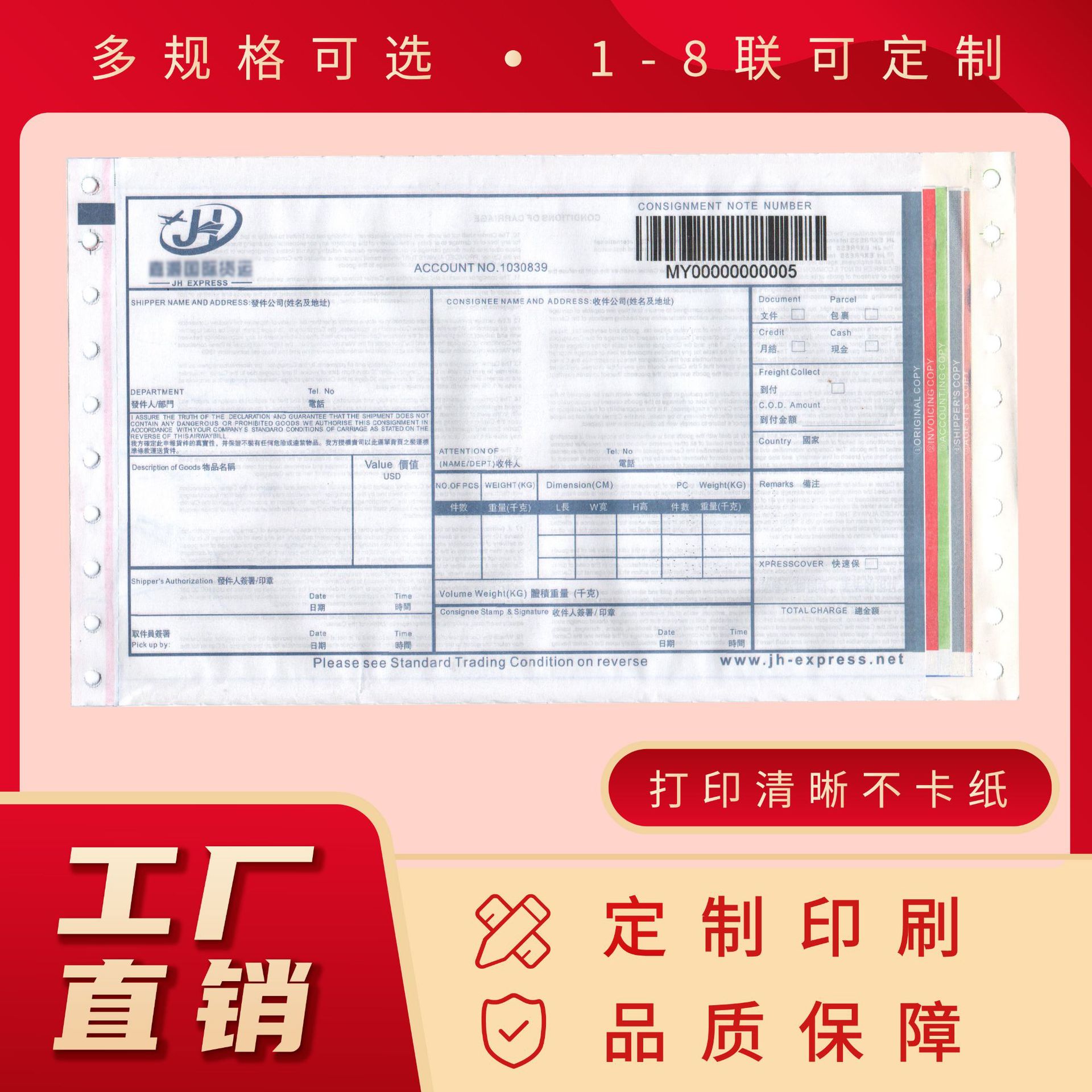 印刷产品:抽取式条码背胶快递单 、条码配页快递单、打码快递单、物流运单、货运单、托运单、海运提单、空运提单、回单袋、子单、电子面单,不干胶等产品。