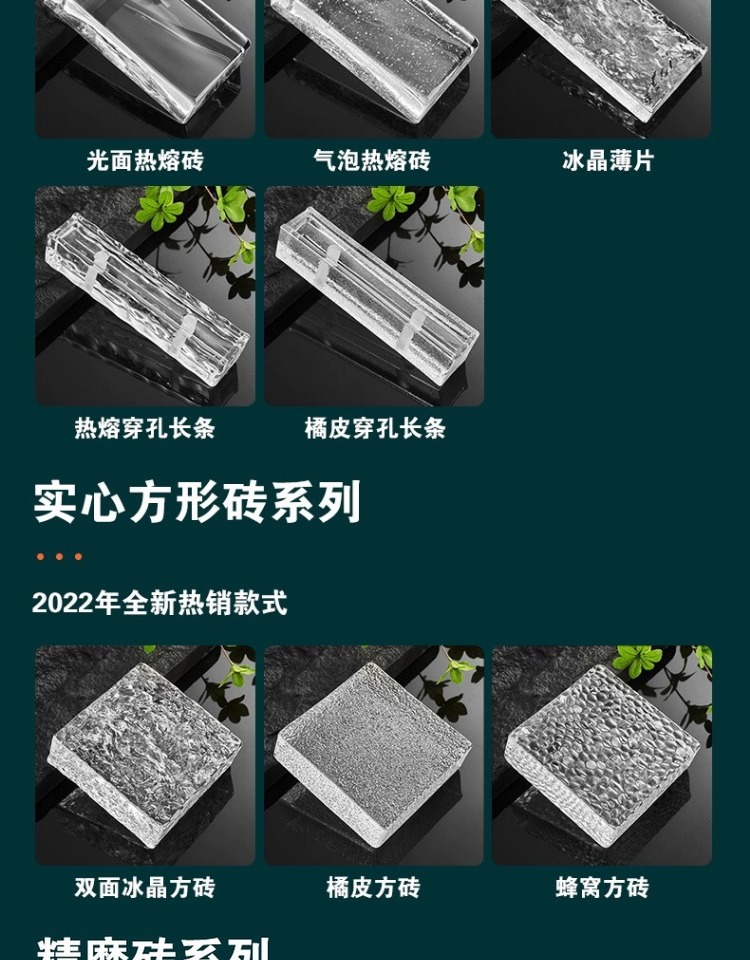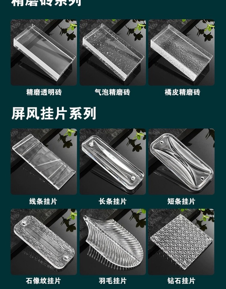 2405050мм полоса с каменным узором 30; 10010050 мм ультрабелый двусторонний кристалл льда 16; 15015050 мм ультрабелая квадратная плитка с кристаллами льда 19; 15015050 мм ультра-белый кирпич сотовой структуры квадратной формы; 15015050 мм ультрабелая квадратная плитка с апельсиновой коркой 20; 19019080 мм ультрабелый полый кирпич с рисунком ледяных кристаллов 26; 19019080мм ультрабелый полый кирпич с рисунком солнца 27; 19019080мм супер белый облачный полый кирпич 25; 20010022 мм хлопья ледяных кристаллов 31; 20010050 мм ультрабелый ананасовый узор 17; 20010050 мм ультрабелый боковой кристалл льда 22; 20010050 мм ультрабелый односторонний кристалл льда 29; 20010050мм ультрабелый глянцевый термоплавкий кирпич 28; 20010050 мм ультрабелый двусторонний кристалл льда 14; 20010050мм ультрабелый двусторонний сотовый 24; 20010050мм ультрабелая двусторонняя апельсиновая корка 23; Изогнутый двусторонний ледяной кристалл 20010050 мм 33; 20010050мм высококачественный ультрабелый двусторонний ледяной кристалл 15; 20010050 мм краска по индивидуальному заказу 18; 24011553мм прямоугольный глянцевый большой кирпич 32