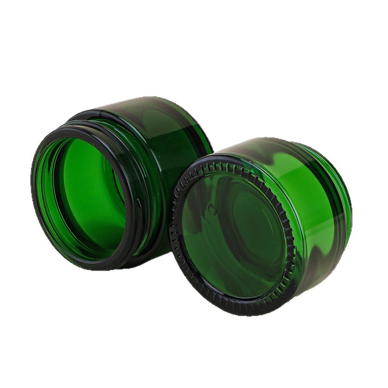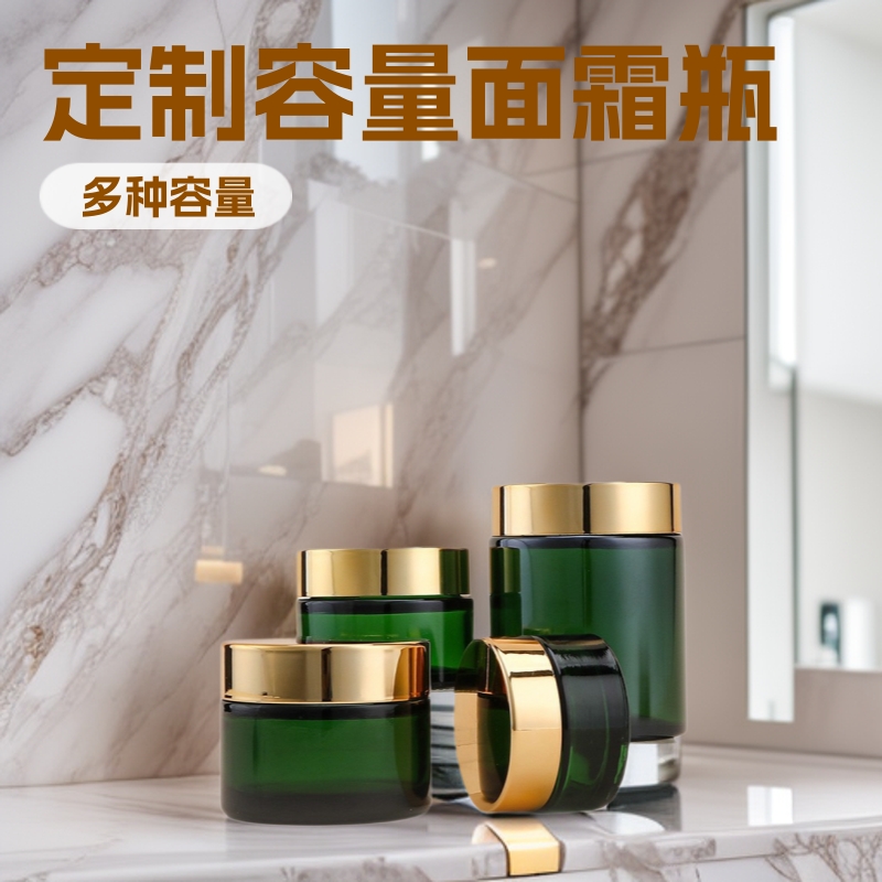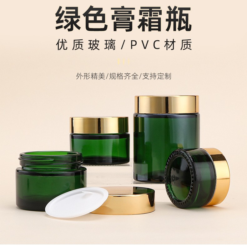 Стеклянная бутылочка для крема, зеленого цвета, с толстым дном, золотой крышкой, объемом 20 мл, изготовленная методом выдувного формования.