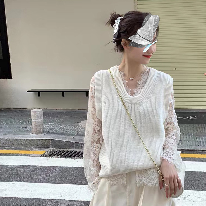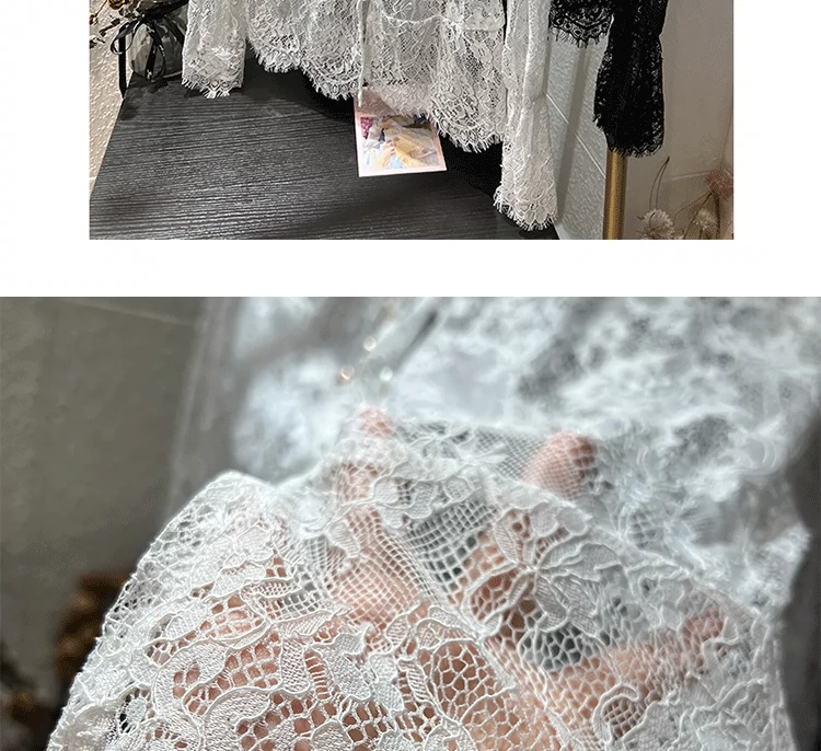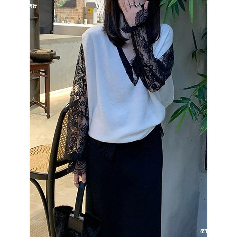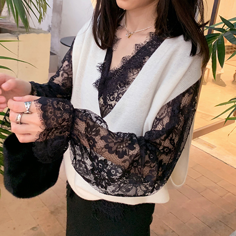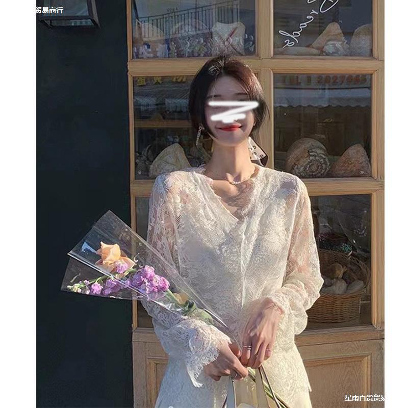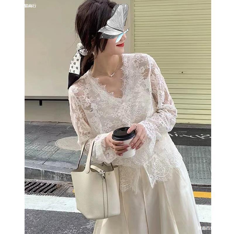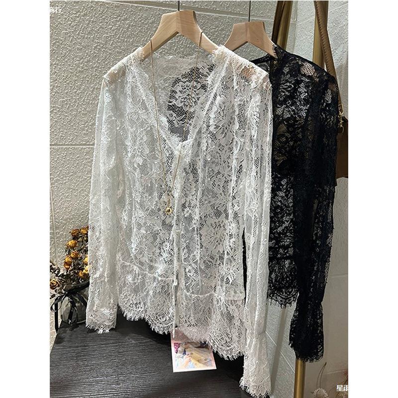 Французская кружевная нижняя рубашка для женщин на весну и осень, новый стильный костюм с рубашкой, стильный сетчатый топ с v-образным вырезом и рукавами-колокольчиками