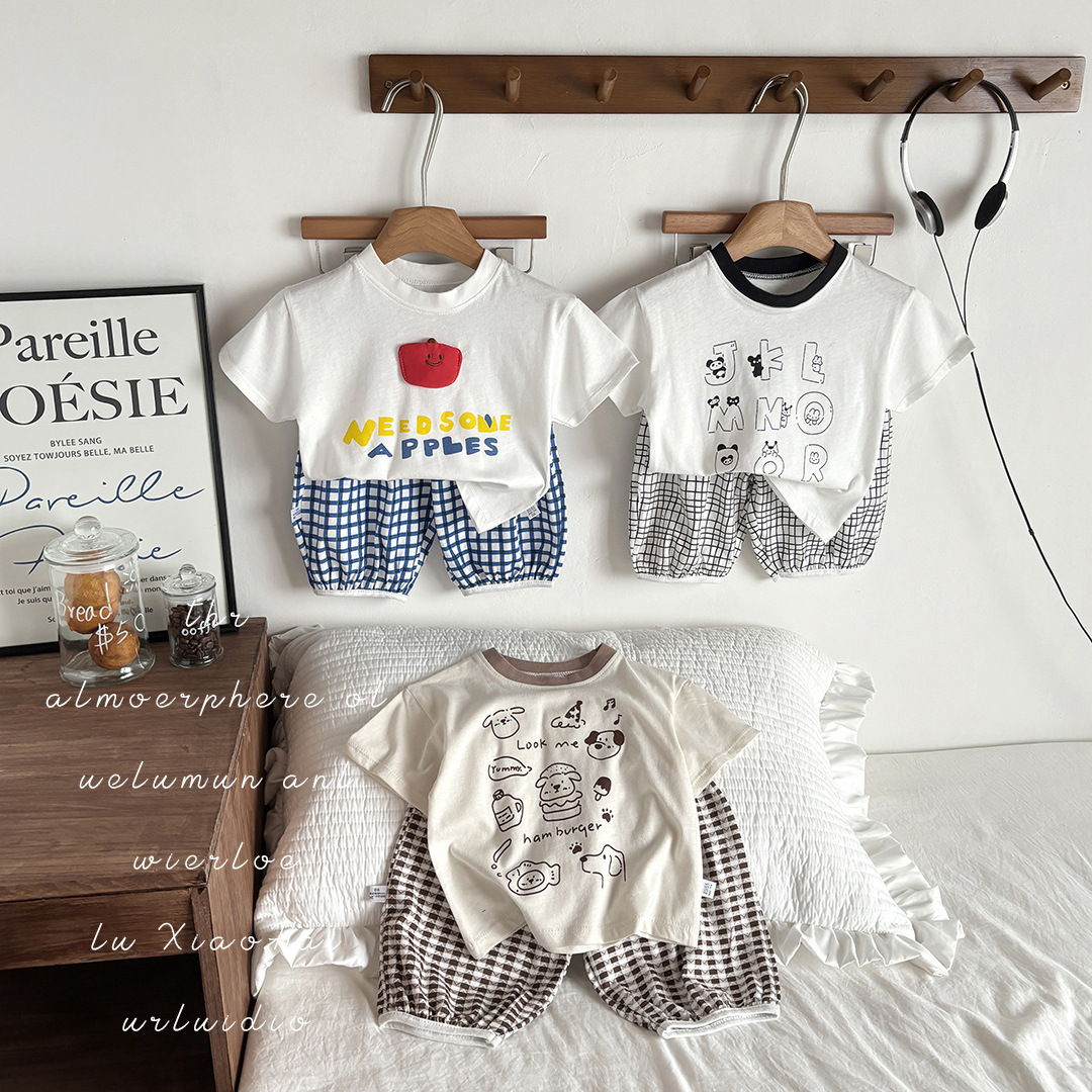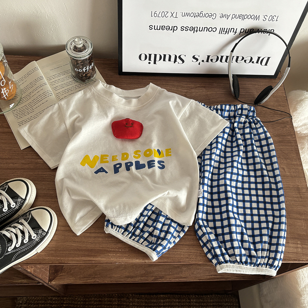 Детский клетчатый костюм для детей от 1 до 7 лет, летняя новая стильная футболка с надписью для мальчиков, шорты для девочек, комплект из двух предметов, детская одежда в корейском стиле