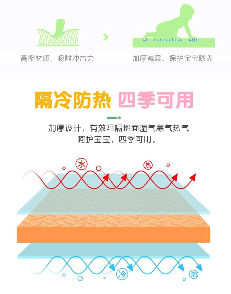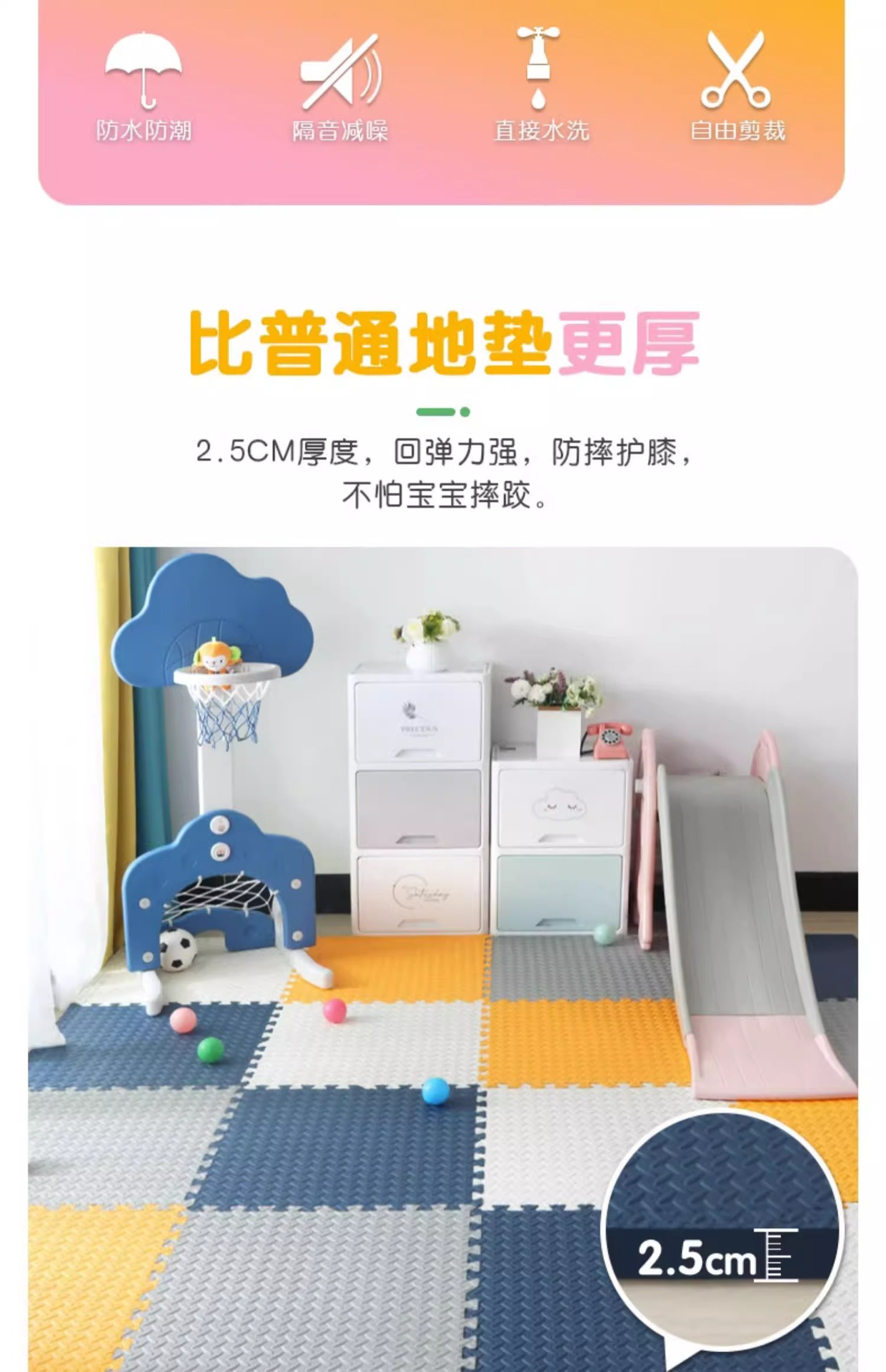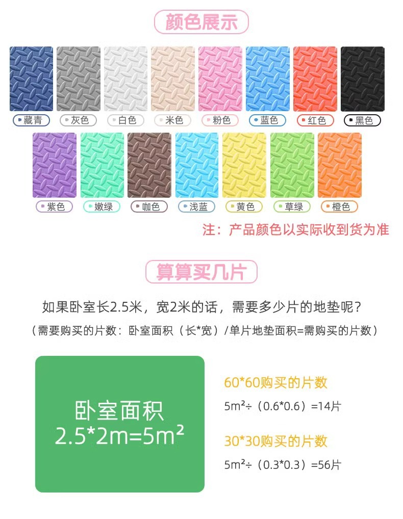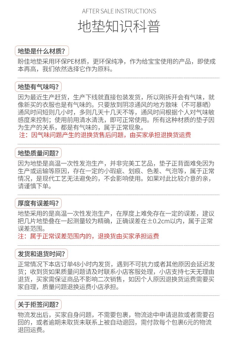 二、垫子是塑料颗粒经高温发泡而成,是有轻微味道的,铺上后通风几天基本就闻不到了,任何厂家都是这样,可放心使用。