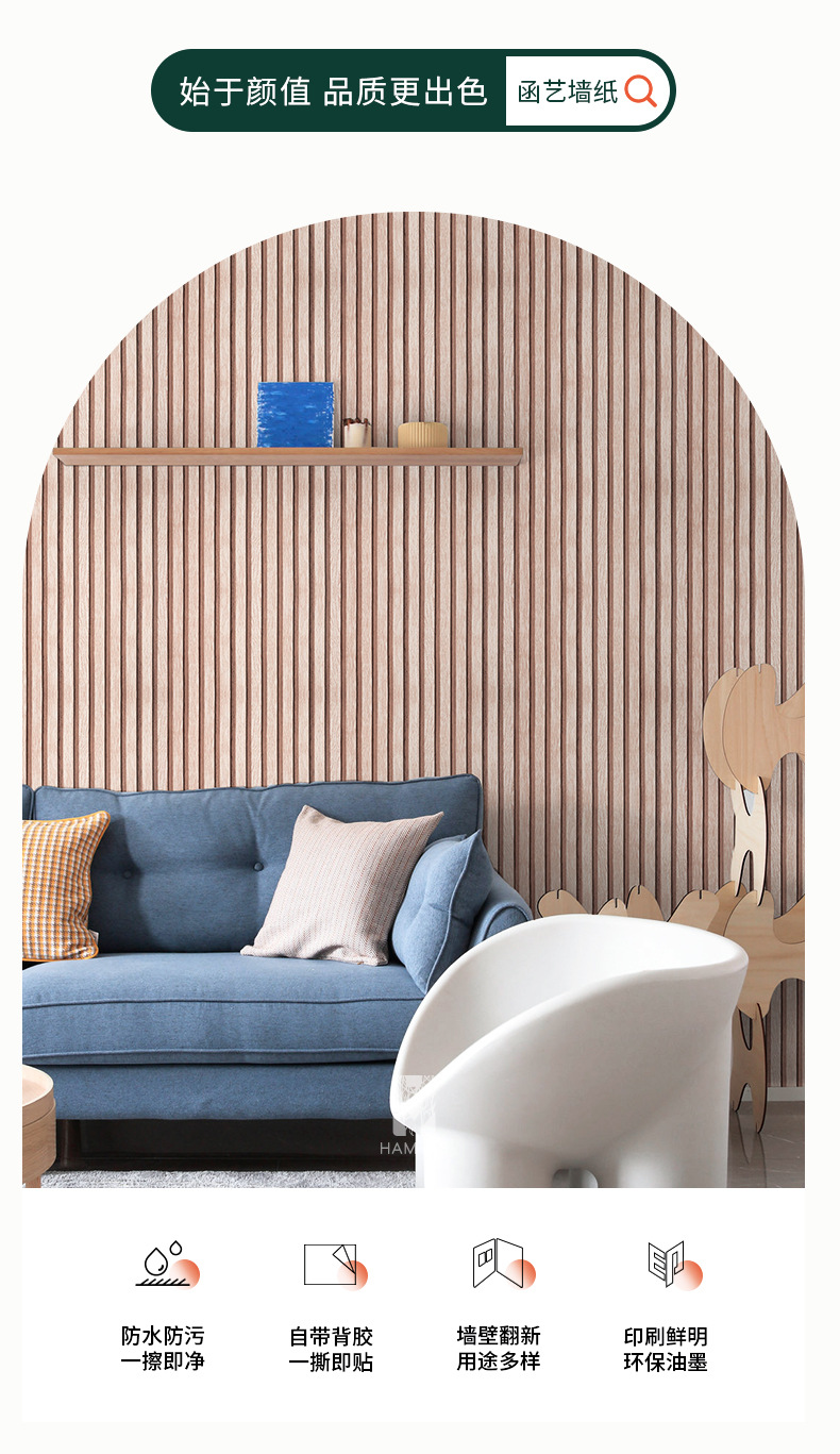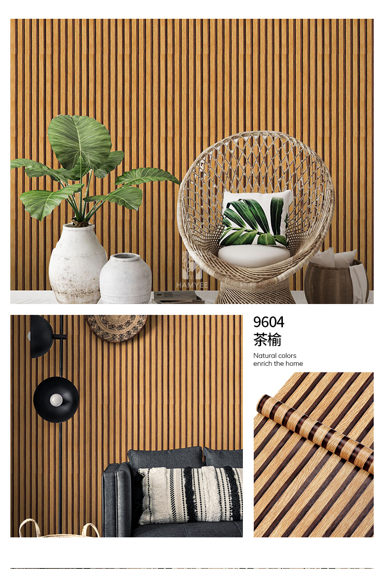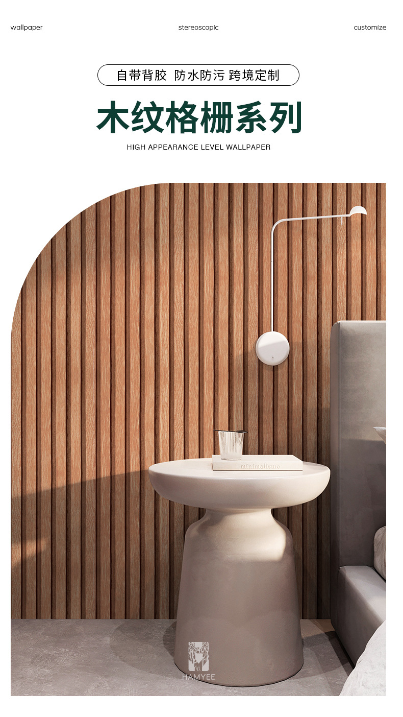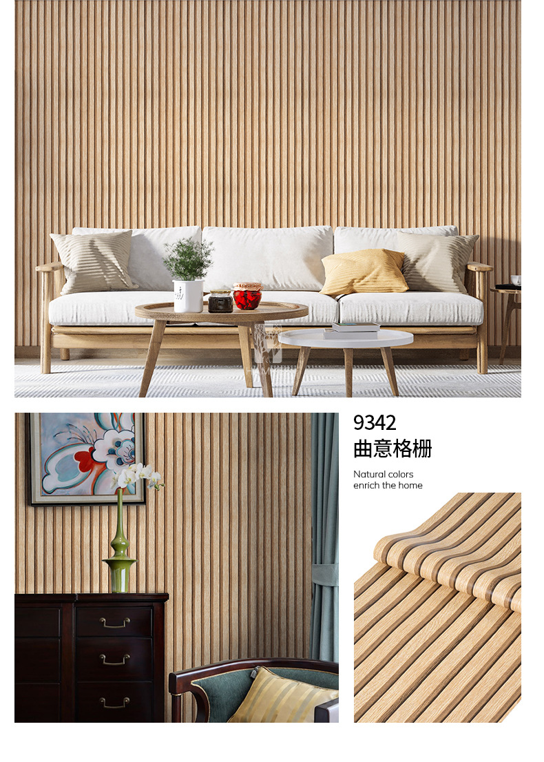 Ремонт стены за телевизором в гостиной с использованием самоклеящихся обоев-наклеек, имитирующих решетку с текстурой дерева, 3D-панели для стен.