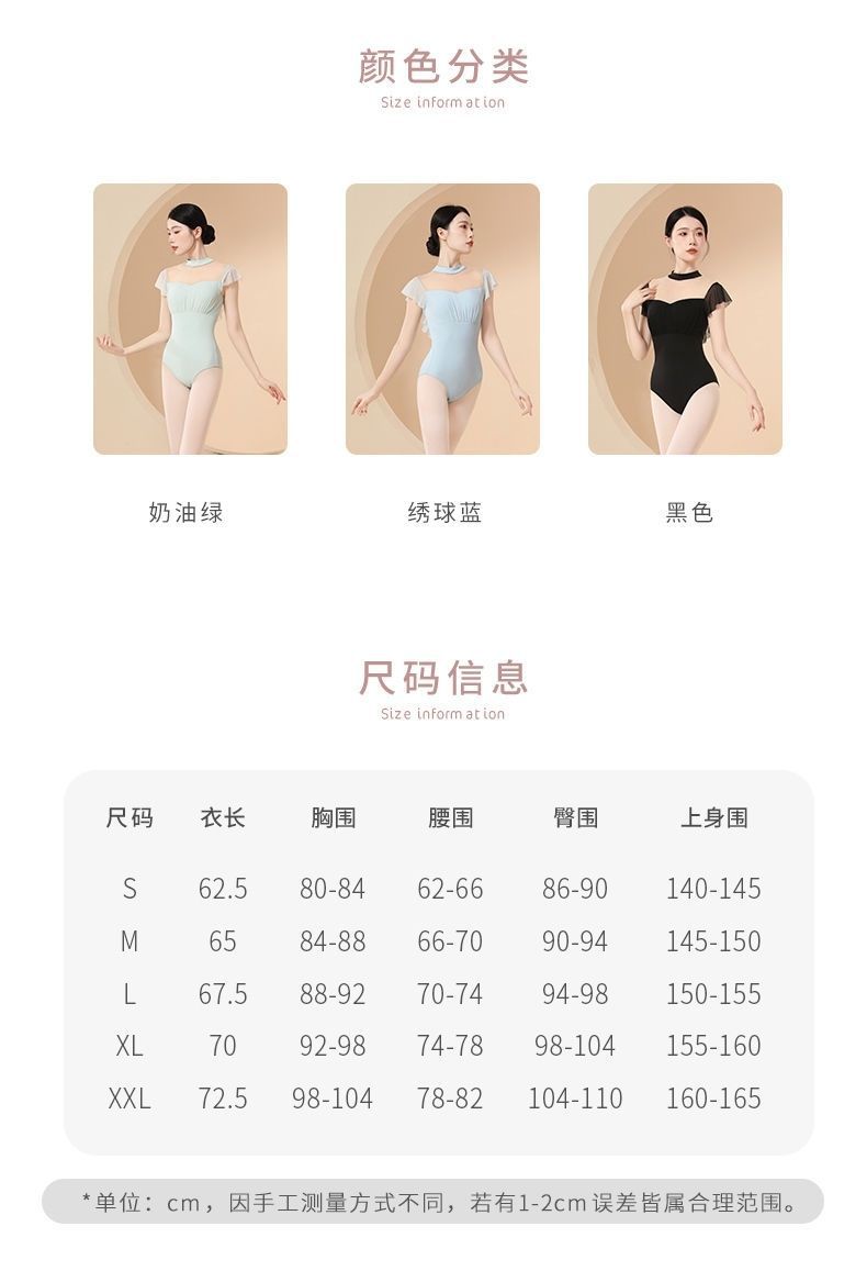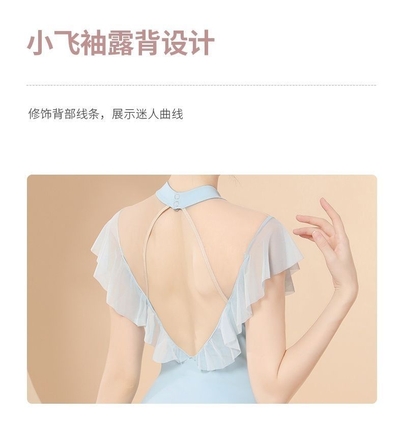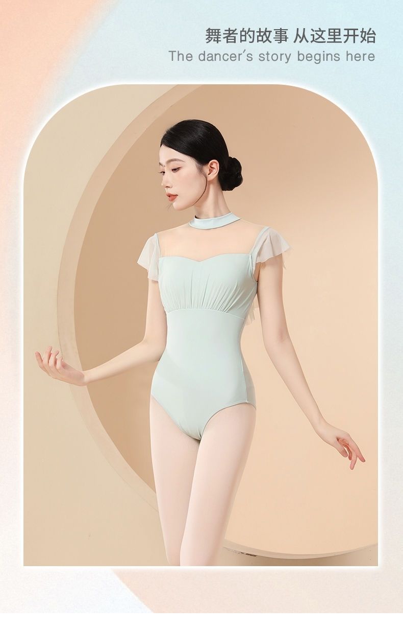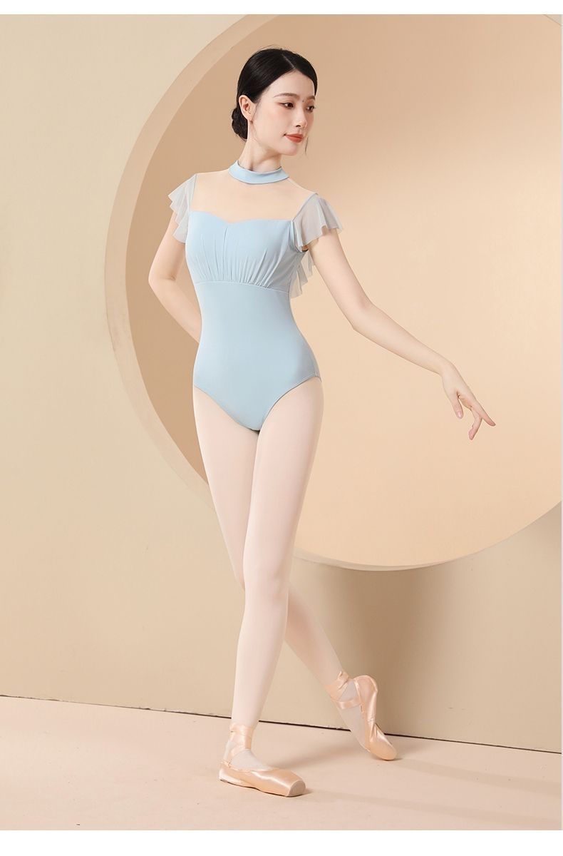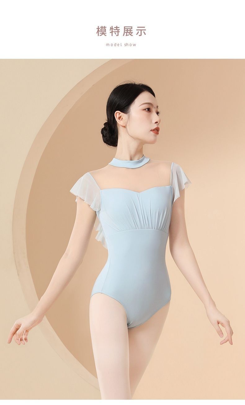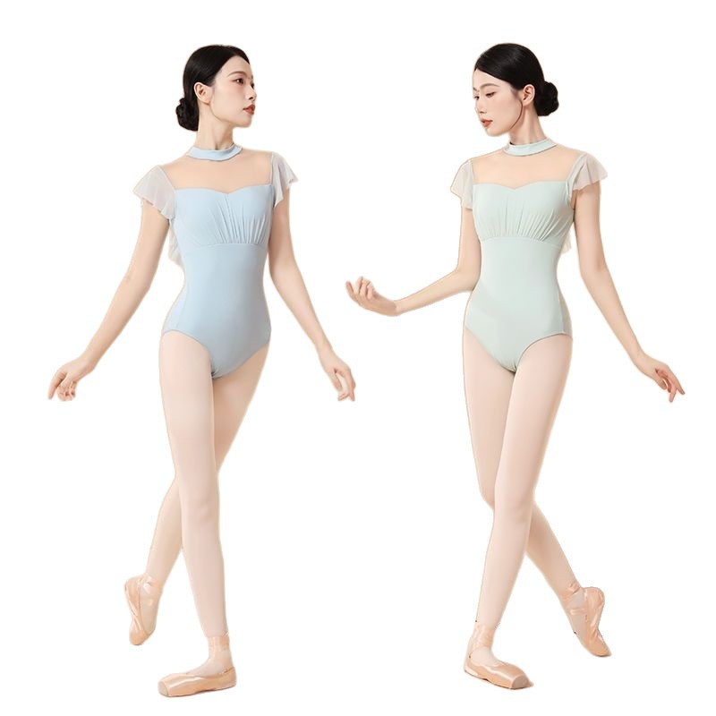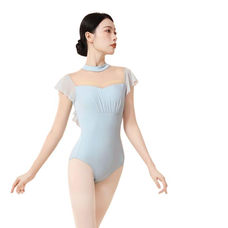 Новая базовая тренировочная одежда для балета для девочек, воротник-стойка без спинки, летняя тренировочная одежда, элегантная гимнастическая одежда для взрослых, маленькие летящие рукава.