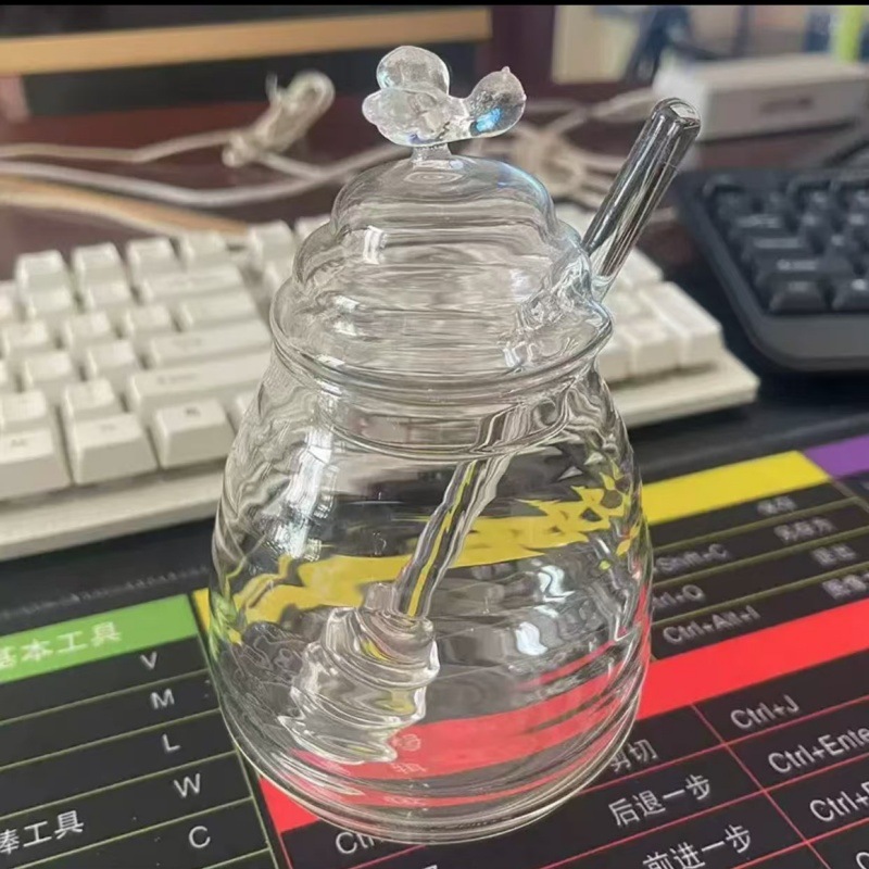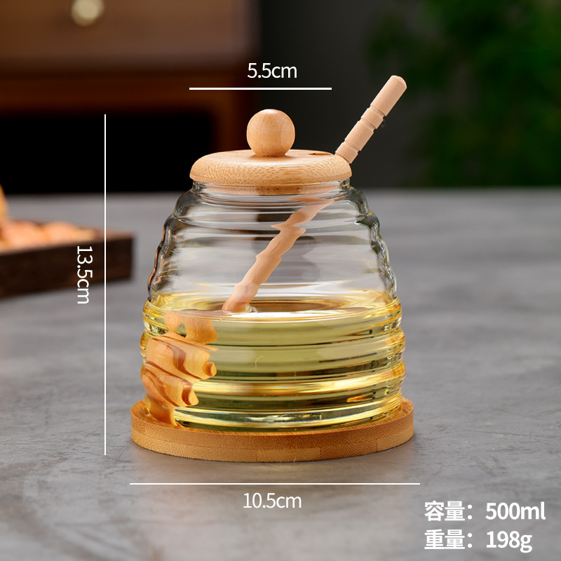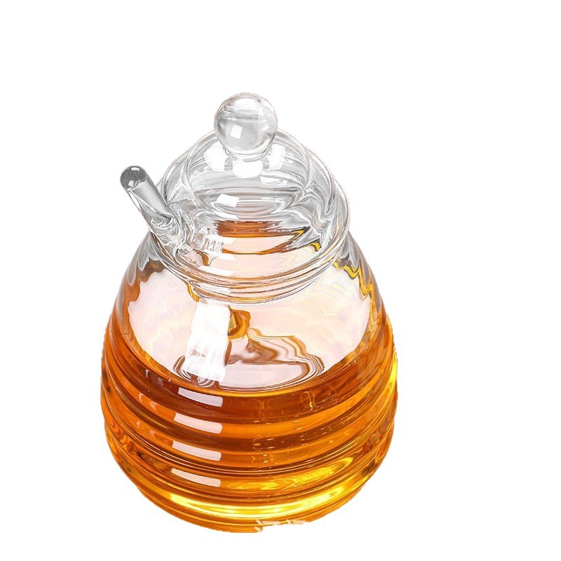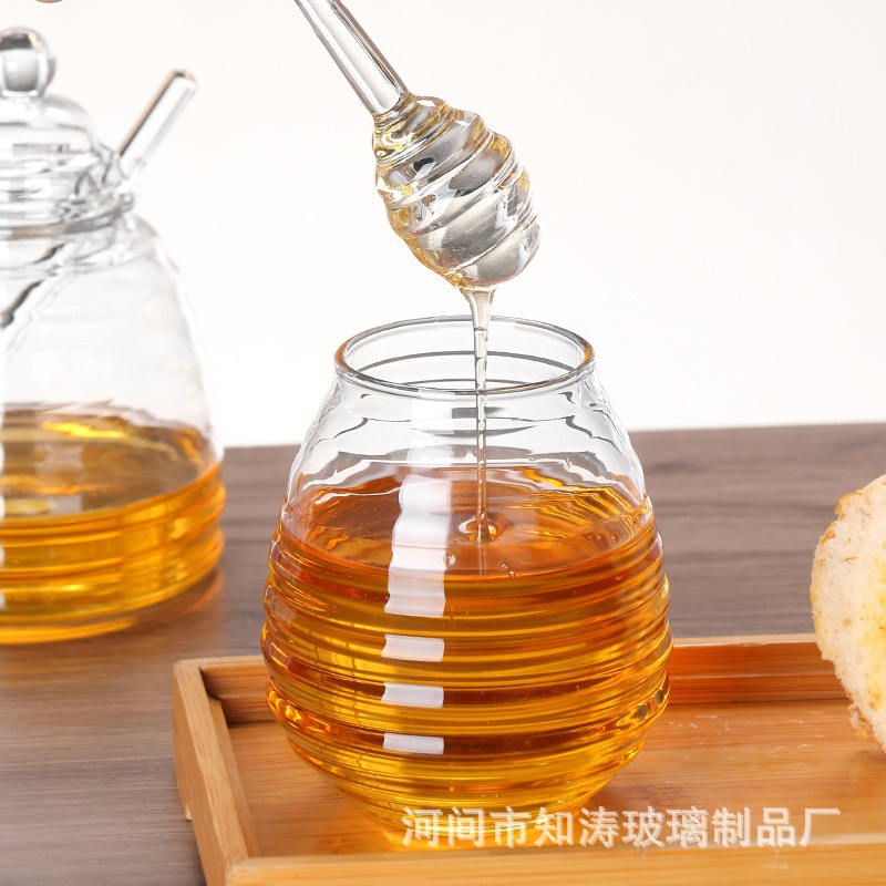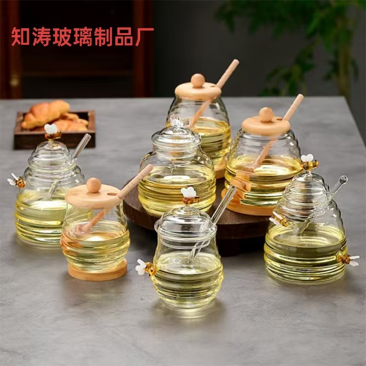 Производитель продает маленькие стеклянные баночки для меда в форме сот с крышками и палочками для перемешивания, креативные кухонные принадлежности.
