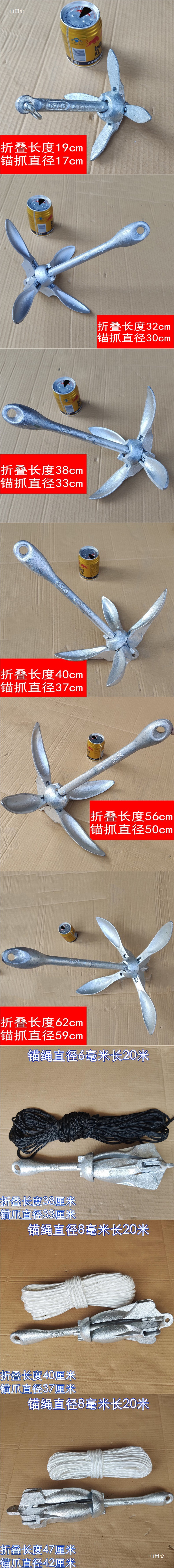 0.7kg + 20m Анкерная веревка; 0.7kg якоря; 1.5kg + 20m Анкерная веревка; 1.5kg якоря; 2.5kg + 20m Анкерная веревка; 2.5kg якоря; 3.2kg + 20m Анкерная веревка; 3.2kg якоря; 4kg + 20m Анкерная веревка; 4kg якоря; 6kg + 20m Анкерная веревка; 6kg якоря; 8kg + 20m Анкерная веревка; 8kg якоря; 12kg + 20m Анкерная веревка; 12kg якоря; 15kg + 20m Анкерная веревка; 15kg якоря