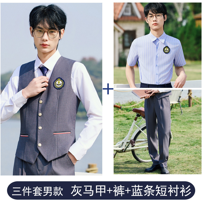 Мужской серый жилет; Мужские серые брюки; Мужской синий жилет; Мужские синие брюки; Женское серое платье; Женское синее платье; Мужской серый жилет + брюки; Мужской синий жилет + брюки; Женское серое платье + синяя короткая рубашка; Женское серое платье + синяя длинная рубашка; Женское синее платье + белая короткая рубашка; Женское синее платье + белая длинная рубашка; Мужской серый жилет + брюки + короткая рубашка в синюю полоску; Мужской серый жилет + брюки + синяя длинная рубашка; Мужской синий жилет + брюки + белая короткая рубашка