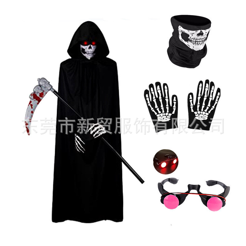 Детский комплект из 4 предметов, размер 90.; Набор из 4 предметов для взрослых, размер 140.; Детский комплект из 5 предметов, размер 90.; Набор из 5 предметов для взрослых, размер 140.; светящиеся красные очки; Детские перчатки в виде черепа; Скелетный коса; Закаленный серп с рисунком из ротанга; Перчатки в виде черепа для взрослых