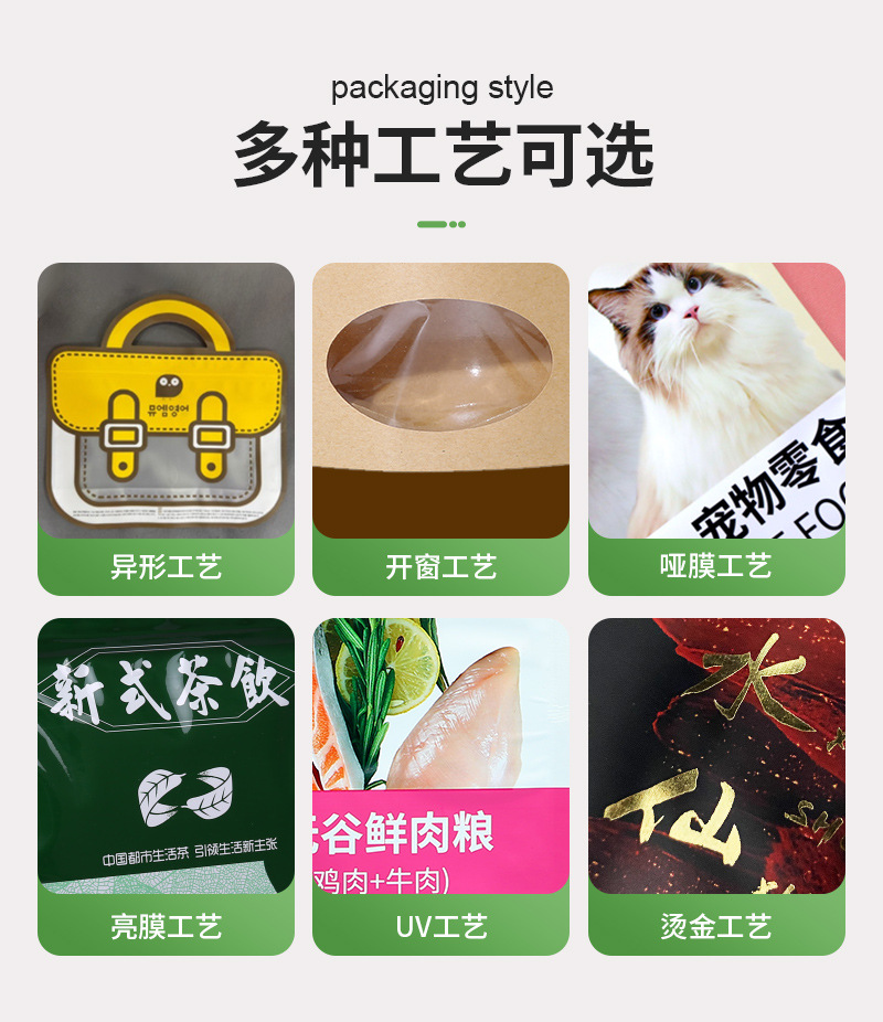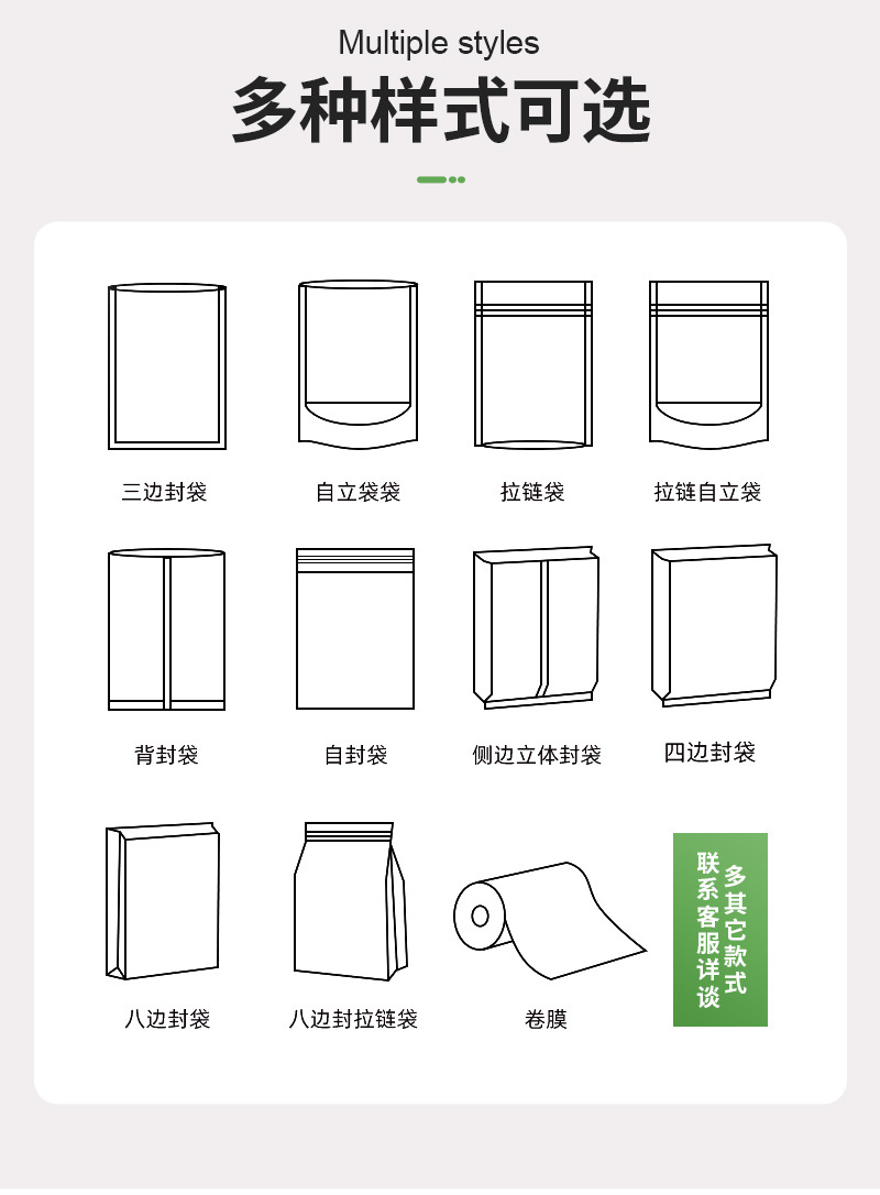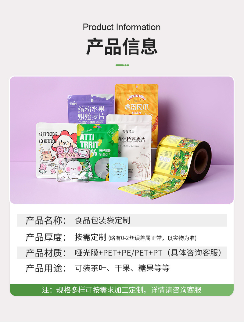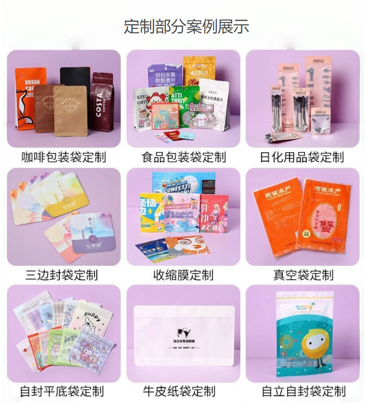 пищевые вакуумные пакеты; Упаковочные пакеты для выпечки; пакетик для упаковки чая; пакеты для упаковки закусок; пакет для упаковки кофе; пакеты для корма для животных; Упаковочный пакет для дуриана; Пакеты для упаковки напитков; Пакеты для упаковки водных продуктов; Пакеты для упаковки твердых напитков; мешок с задним уплотнением; Трехсторонний герметичный пакет; Самозакрывающийся пакет с плоским дном.; Отдельно стоящая сумка с застежкой-молнией.; Восемь боковых уплотнительных пакетов; Коричневый упаковочный бумажный пакет; Сумки специальной формы; термоусадочная пленка; Рулонная пленка