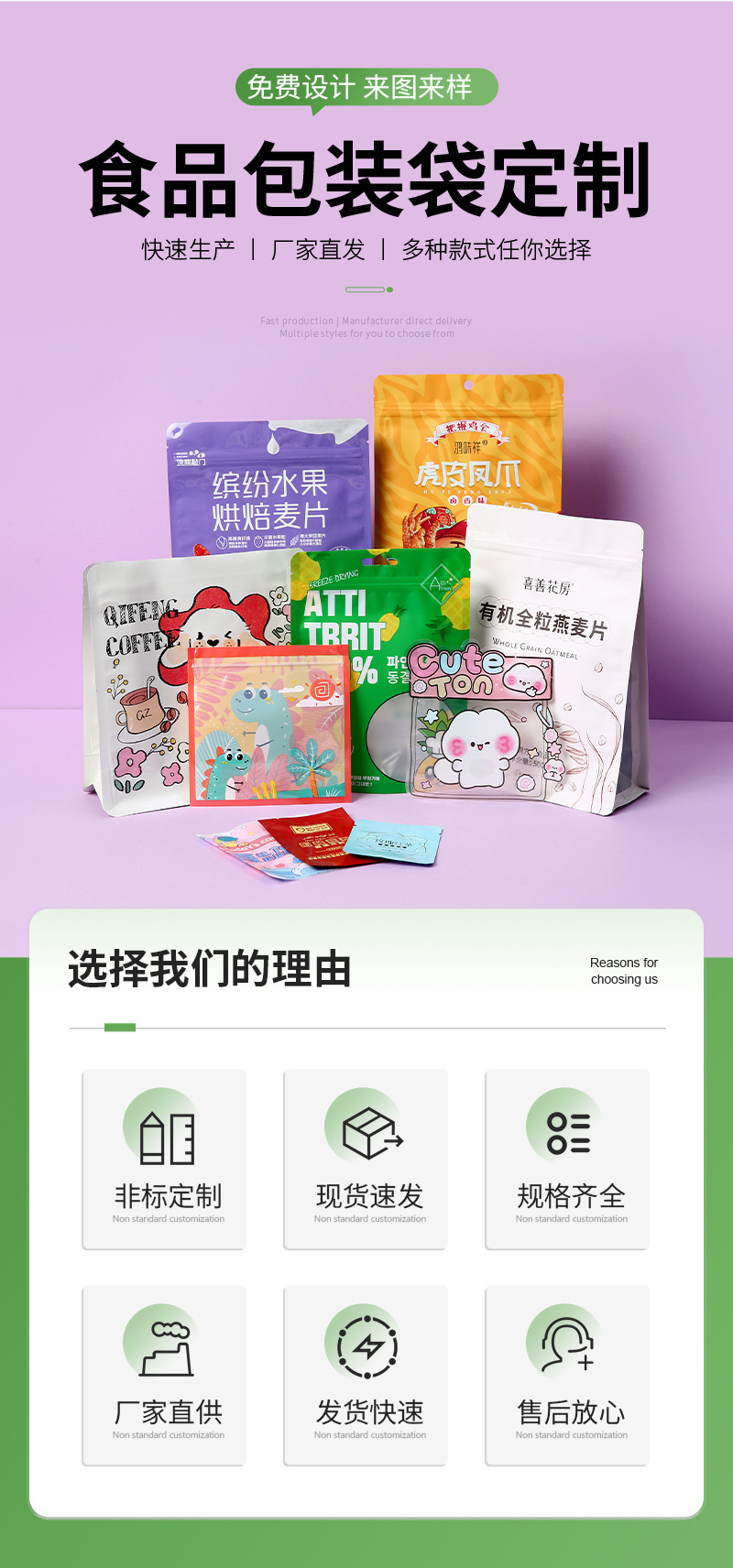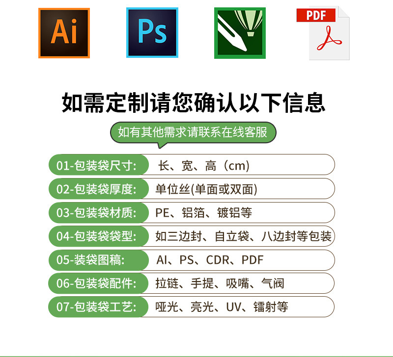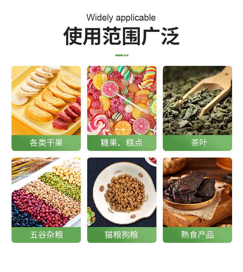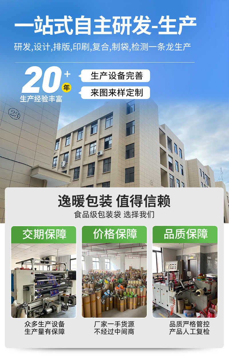 пищевые вакуумные пакеты; Упаковочные пакеты для выпечки; пакетик для упаковки чая; пакеты для упаковки закусок; пакет для упаковки кофе; пакеты для корма для животных; Упаковочный пакет для дуриана; Пакеты для упаковки напитков; Пакеты для упаковки водных продуктов; Пакеты для упаковки твердых напитков; мешок с задним уплотнением; Трехсторонний герметичный пакет; Самозакрывающийся пакет с плоским дном.; Отдельно стоящая сумка с застежкой-молнией.; Восемь боковых уплотнительных пакетов; Коричневый упаковочный бумажный пакет; Сумки специальной формы; термоусадочная пленка; Рулонная пленка