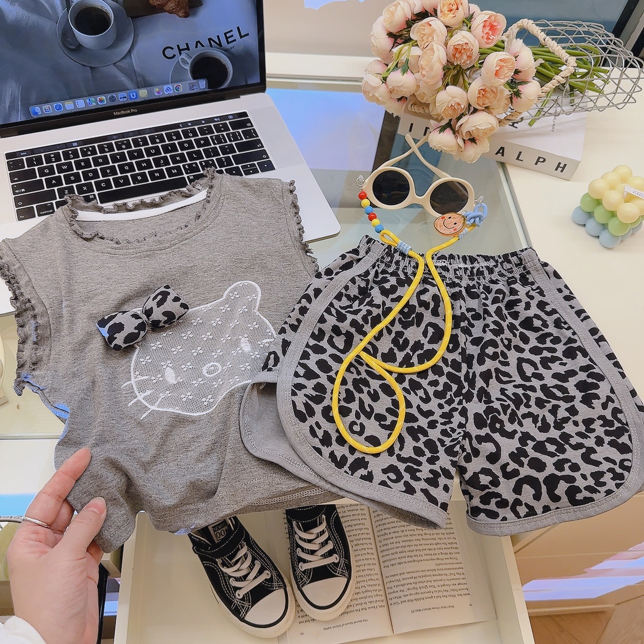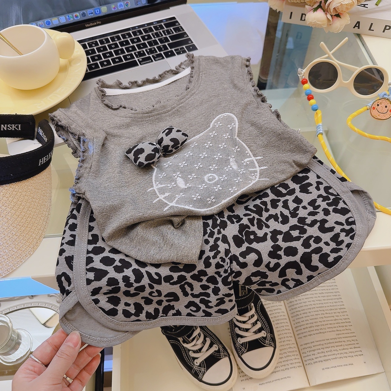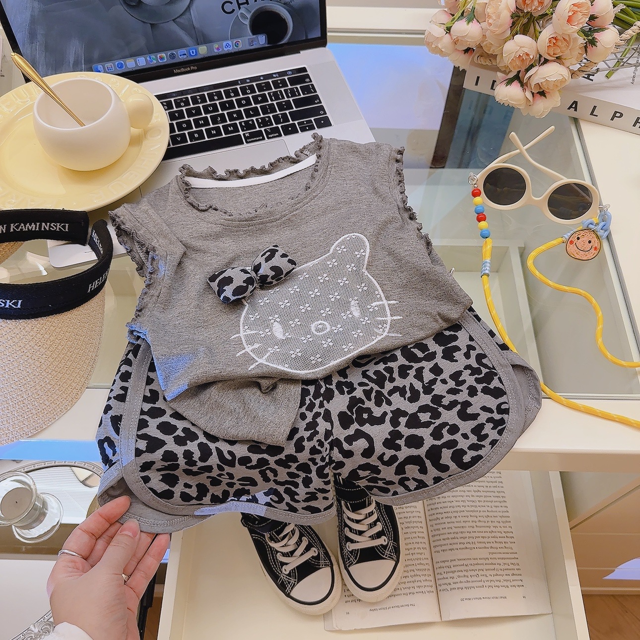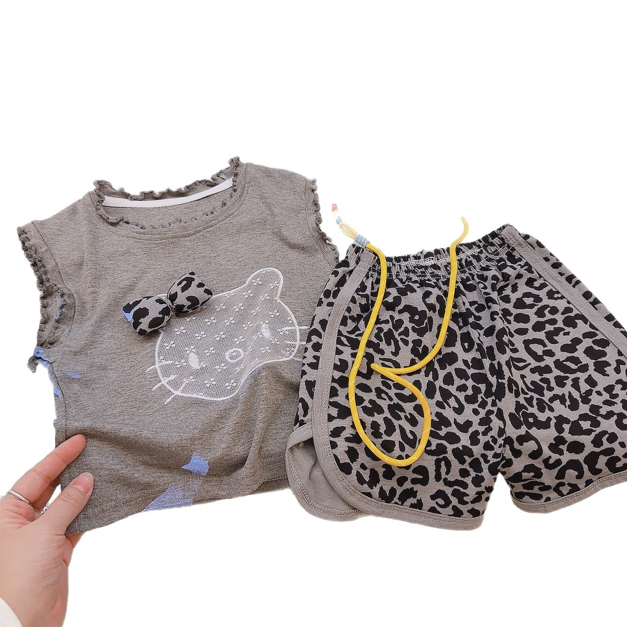 Комплект из двух предметов категории A для девочек, детский комплект из модала с летающими рукавами и бантом, летние шорты с короткими рукавами и рисунком из мультфильма