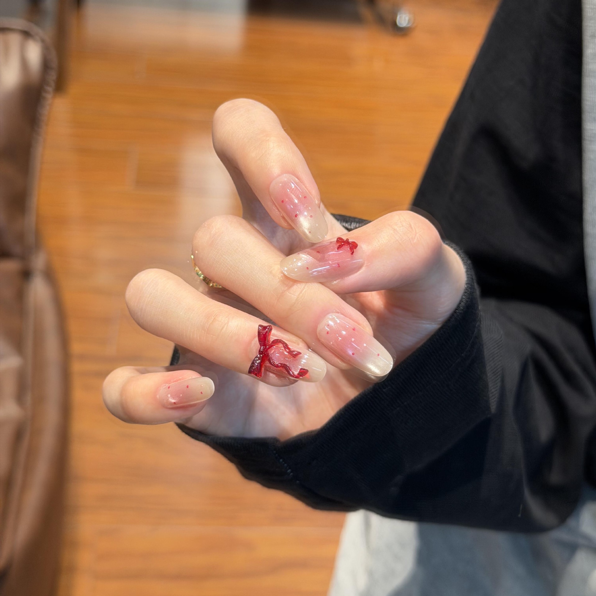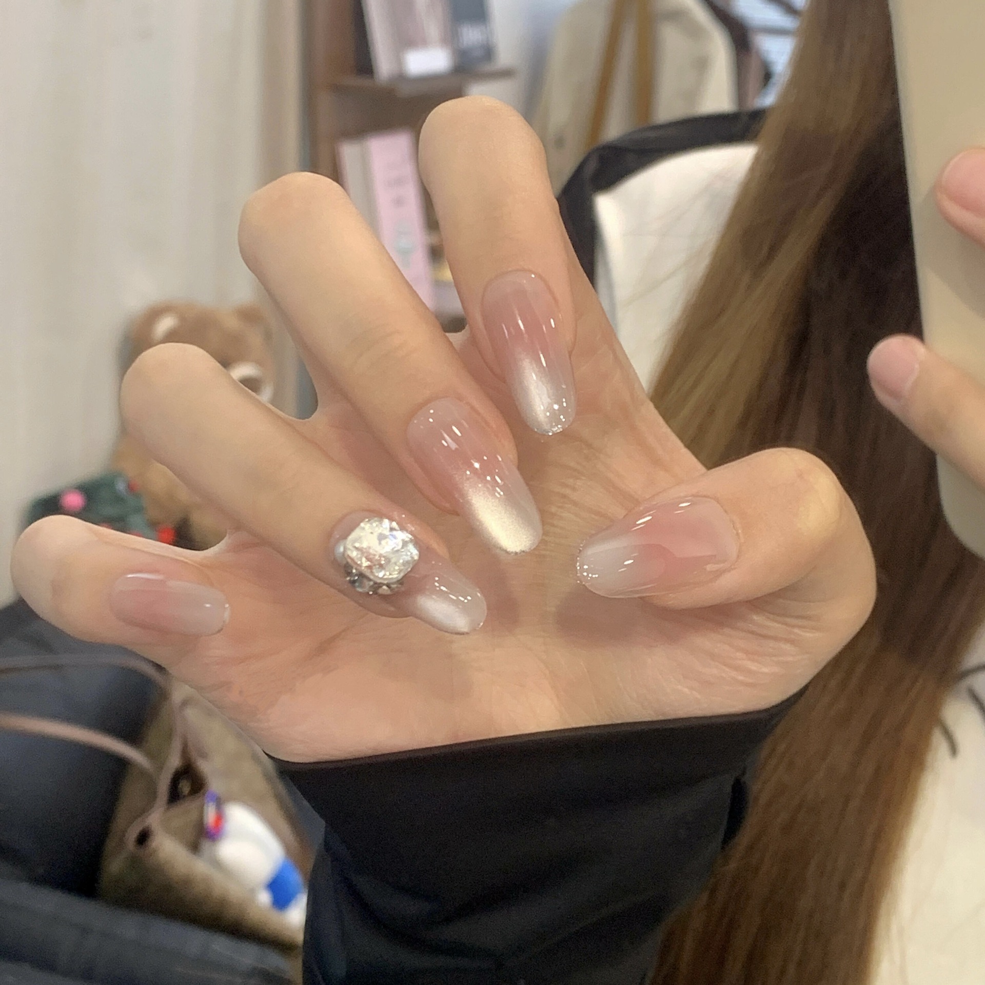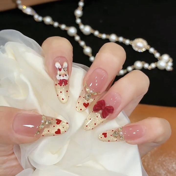 Сверкающие ногти ручной работы в французском стиле для девочек с ручной росписью KT, милые кошачьи глаза, носимые ногти, универсальные короткие ногти в форме сердца, осветляющие.