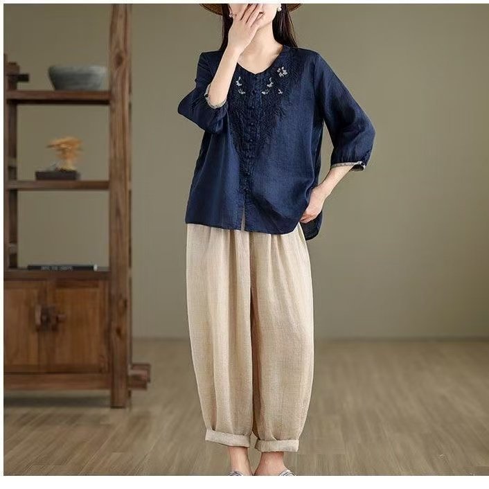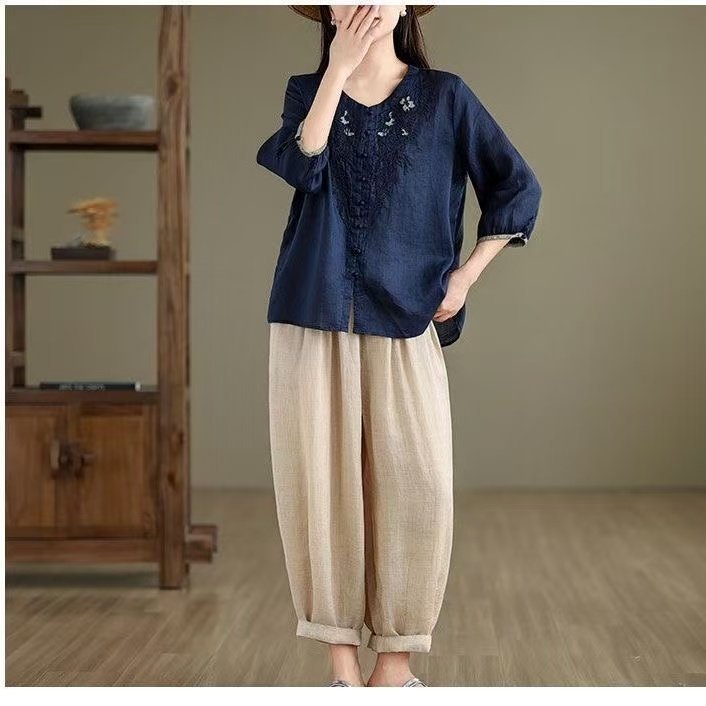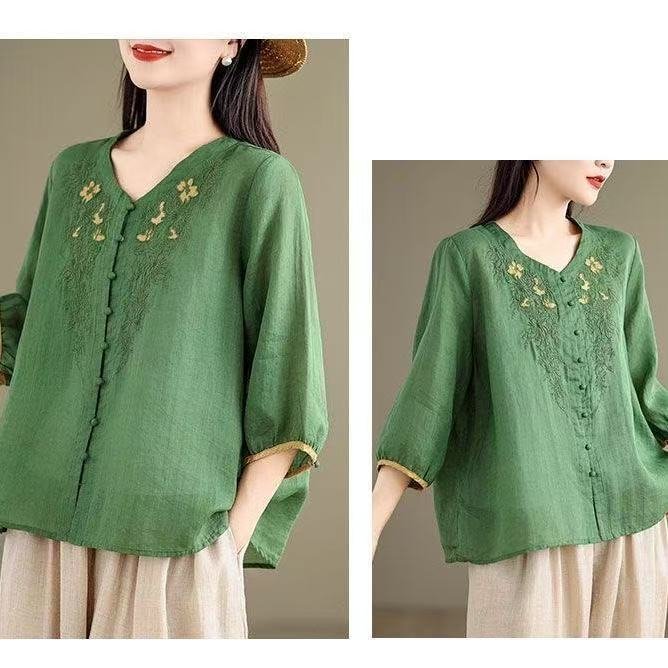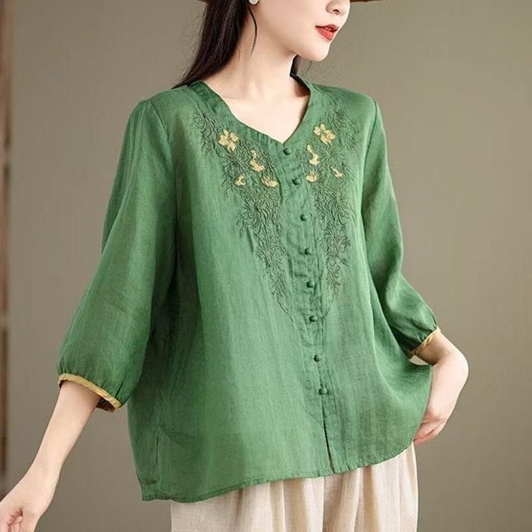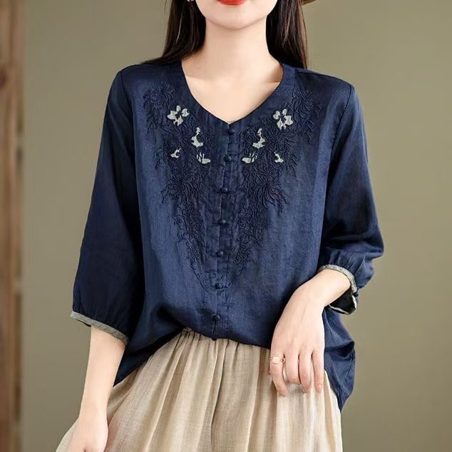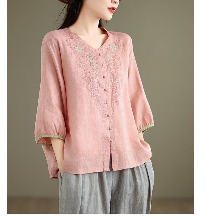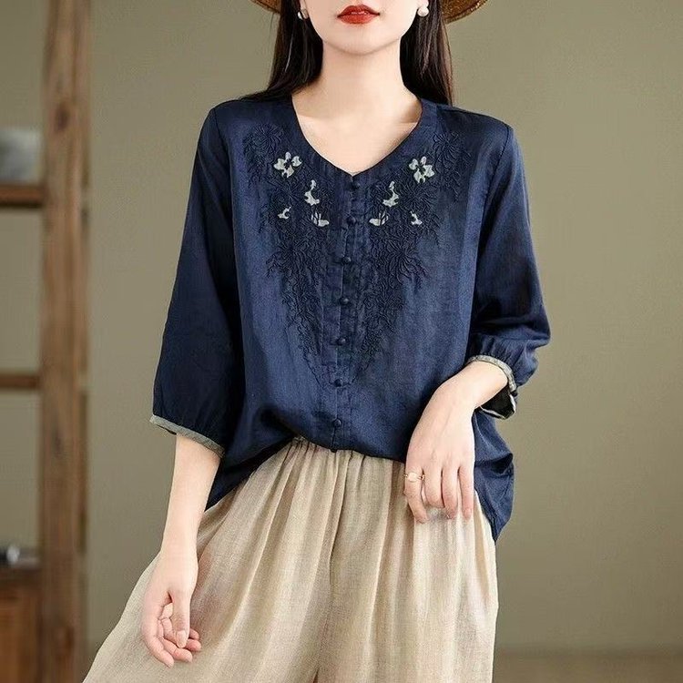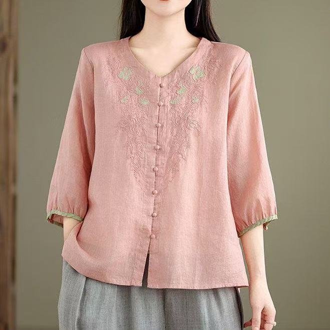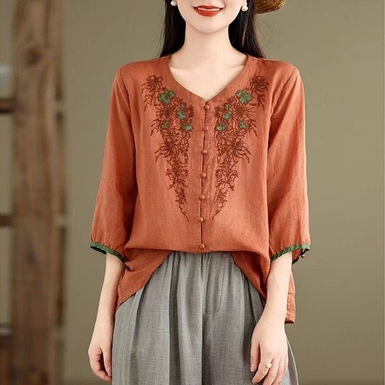 Летняя женская футболка среднего возраста из тенселя из хлопка и льна со средним рукавом, рубашка в стиле мамы с вышивкой и v-образным вырезом, свободный топ большого размера