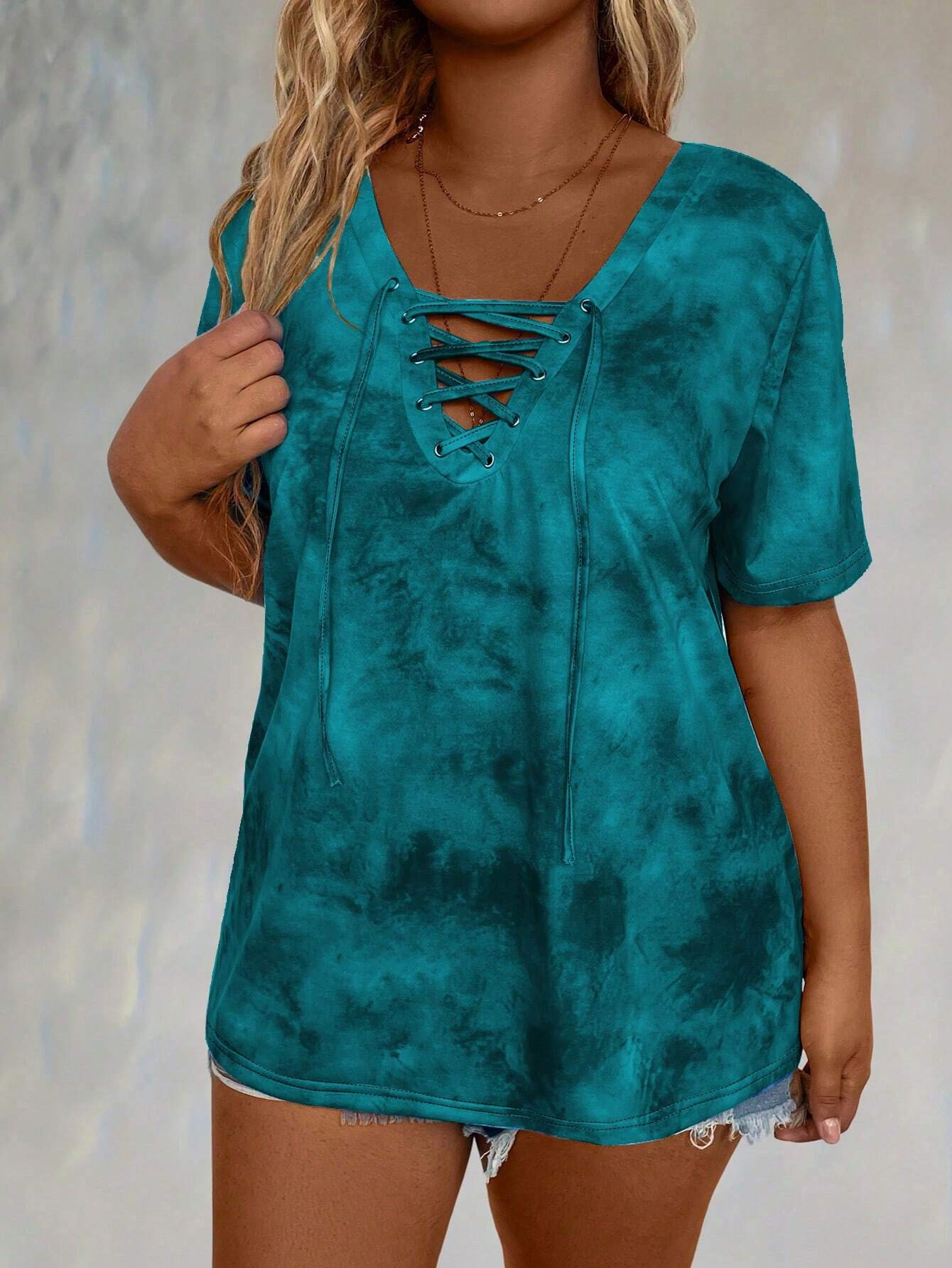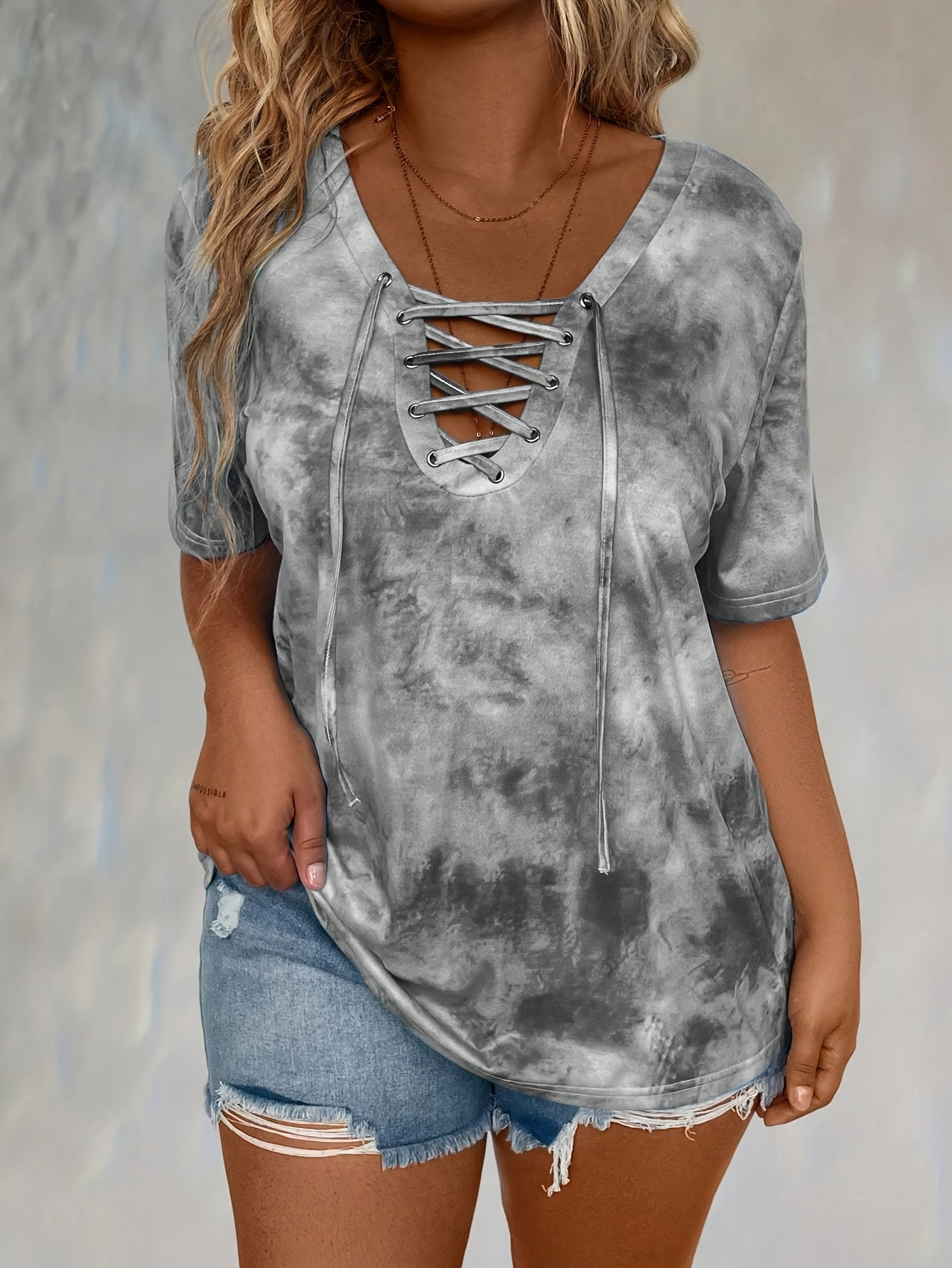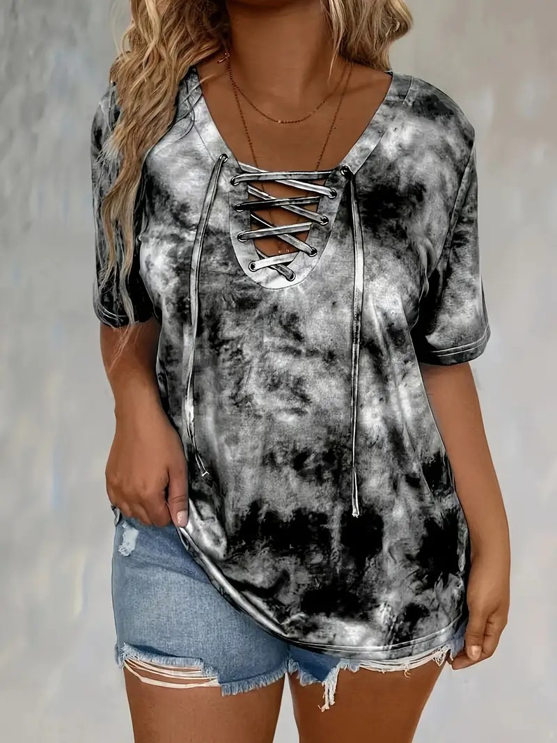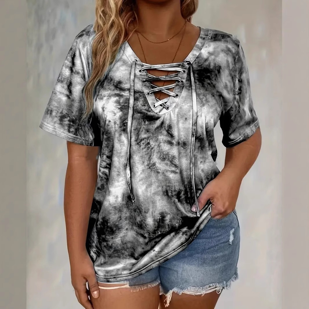2025 трансграничная европейская и американская женская футболка с v-образным вырезом и шнуровкой, топы с короткими рукавами, летняя новая женская одежда больших размеров