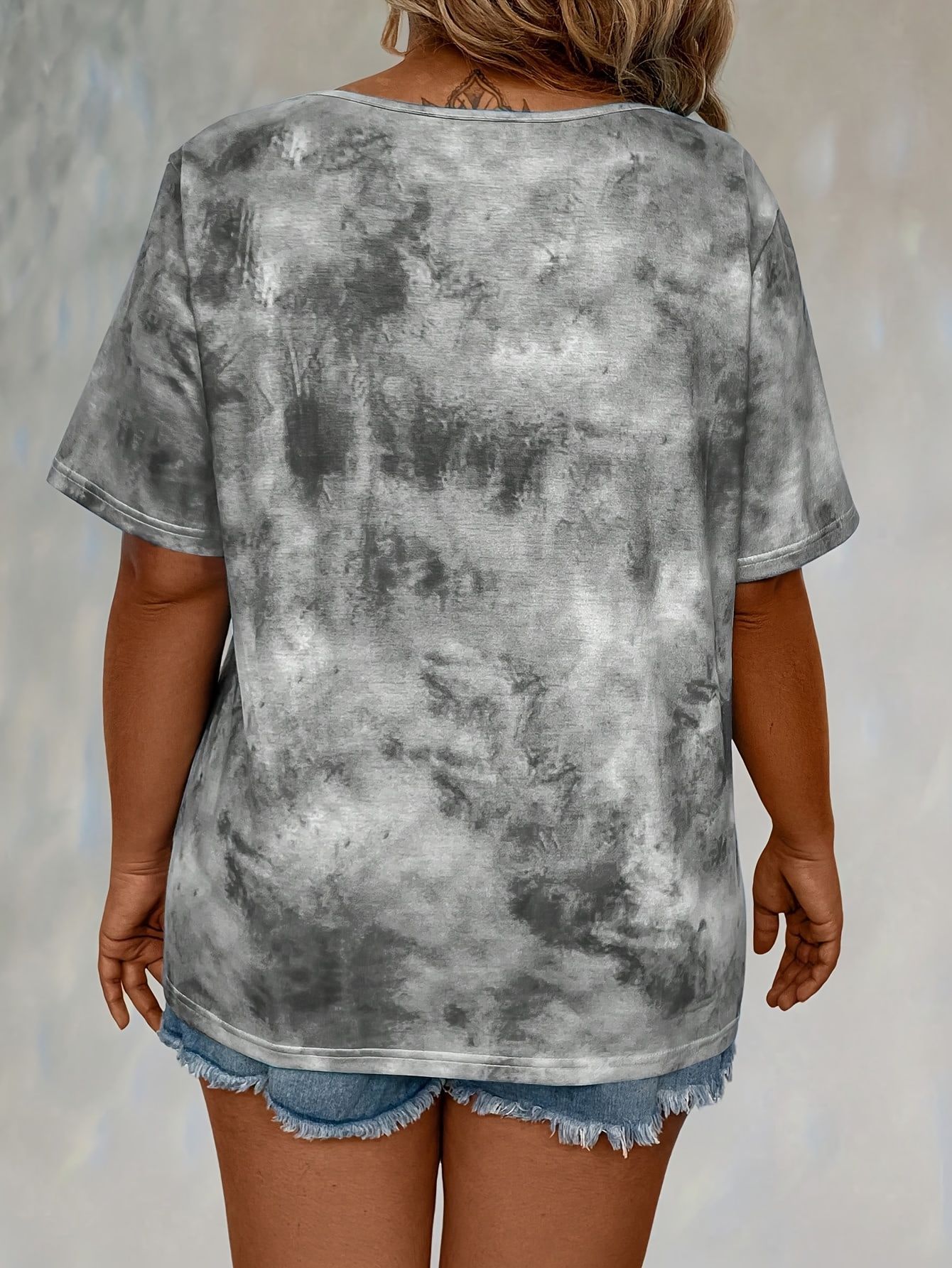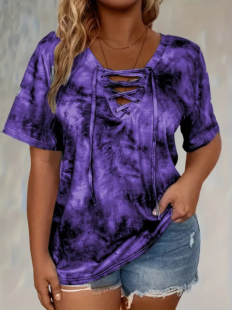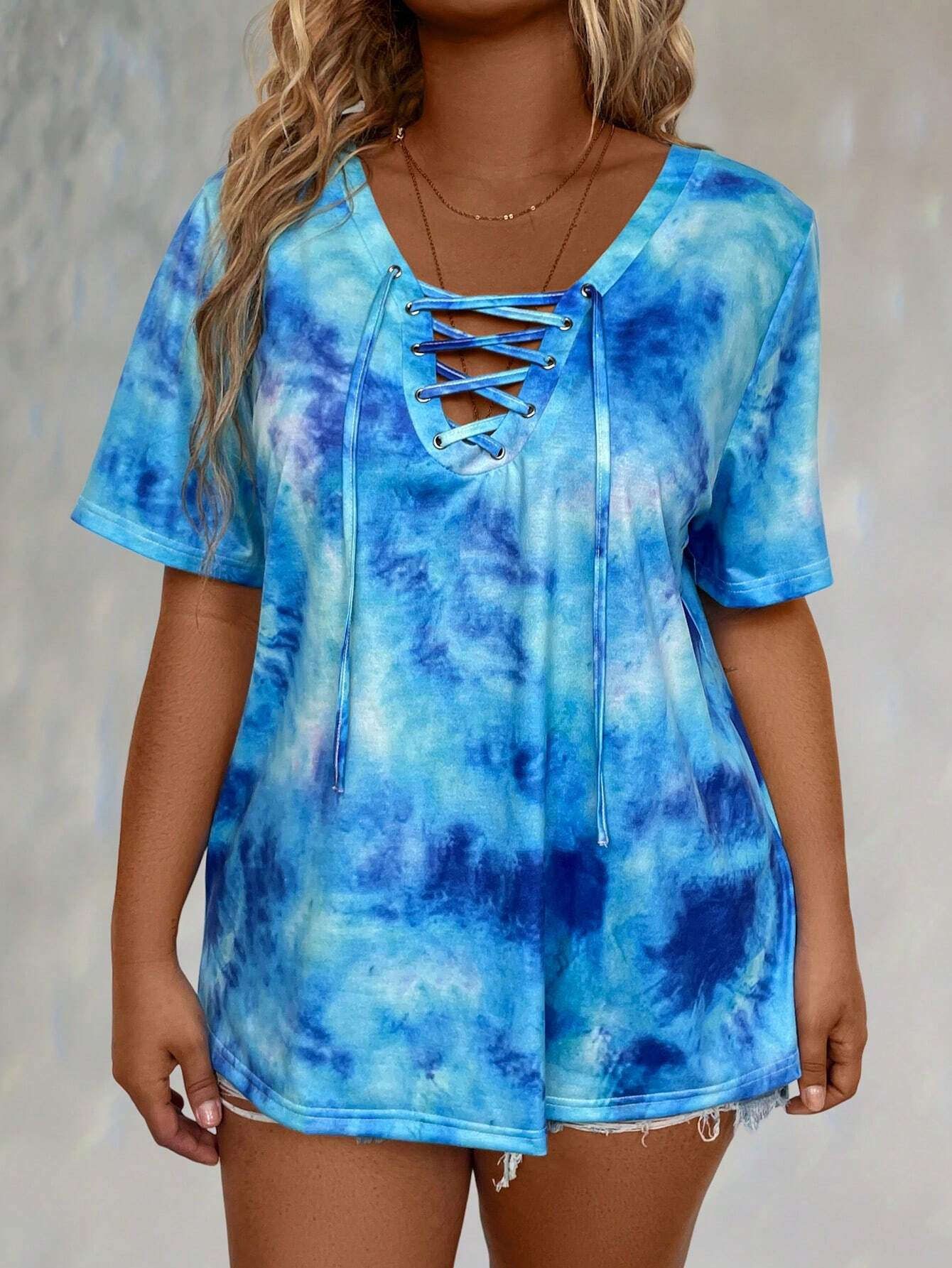 2025 трансграничная европейская и американская женская футболка с v-образным вырезом и шнуровкой, топы с короткими рукавами, летняя новая женская одежда больших размеров