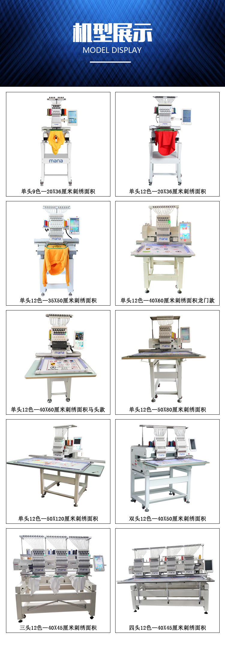 Одиночная головка, 9-контактный разъем, 20*36 см.; Одинарная головка 12 игл 20*36см.; Одноголовочная новая модель 20*36Pro; Одинарная головка, 12 контактов, 35*50 см; Вышивка капюшона с одной головкой и 15 игл 35*50 см; Новая игла Pro12 с одной головкой 35*50 см.; Новая одинарная игла Pro15 35*50 см; Новая игла Pro12 40*60 см; Одиночная головка, 12 контактов, 40*60 см; Одна головка, 12 игл 50*80 см.; Одна головка, 12 игл 50*120 см.; Одна головка, 12 игл 80*120 см.; Двусторонний 12-контактный 40*50 см; Три головки, 12 игл 40*45 см.; Четыре головки, 12 игл, 40*45 см.; Шесть головок, 12 игл, 40*45 см.; Восемь головок, 12 игл, 40*45 см.; 10 головок, 12 игл 40*45 см.; Двенадцать головок, 12 игл, 40*45 см.; Устройство для вышивки шапок; депозит