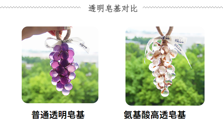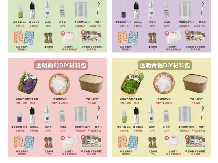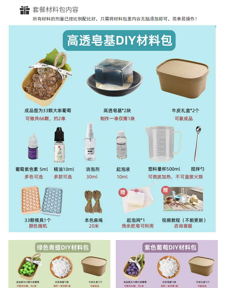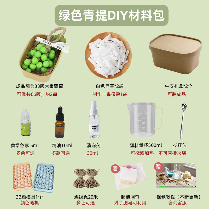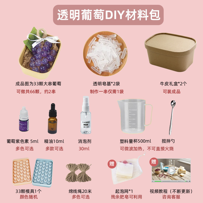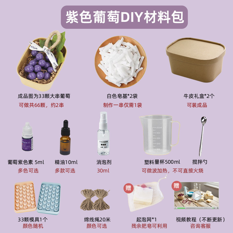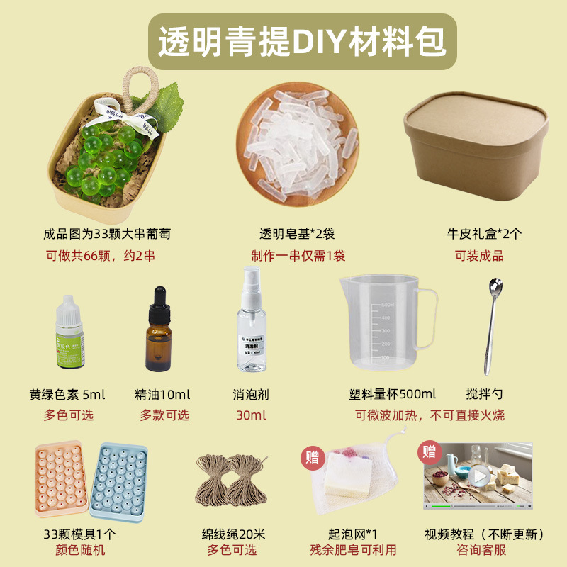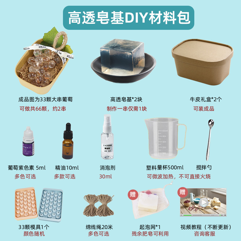 Из упаковки фиолетового винограда можно сделать 2 грозди.; Из упаковки зеленого винограда можно сделать 2 шампура.; Из прозрачной упаковки из винограда можно сделать 2 грозди.; Из прозрачной зеленой упаковки можно сделать 2 шампура.; Высокопрозрачная упаковка из мыльного материала может состоять из 2-х нитей.; Водонепроницаемый плавящийся набор из трех предметов без плиты; Водонепроницаемый плавящийся набор из четырех предметов.; 33 формы для винограда; Квадратная подарочная коробка из воловьей кожи; Прозрачная мыльная основа 250г.; Белая мыльная основа 250г.; Высокопрозрачная мыльная основа 250г.; Овальная толстая подарочная коробка; Хлопковая веревка 10m (по умолчанию цвет верблюжий)
