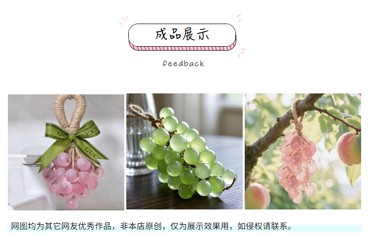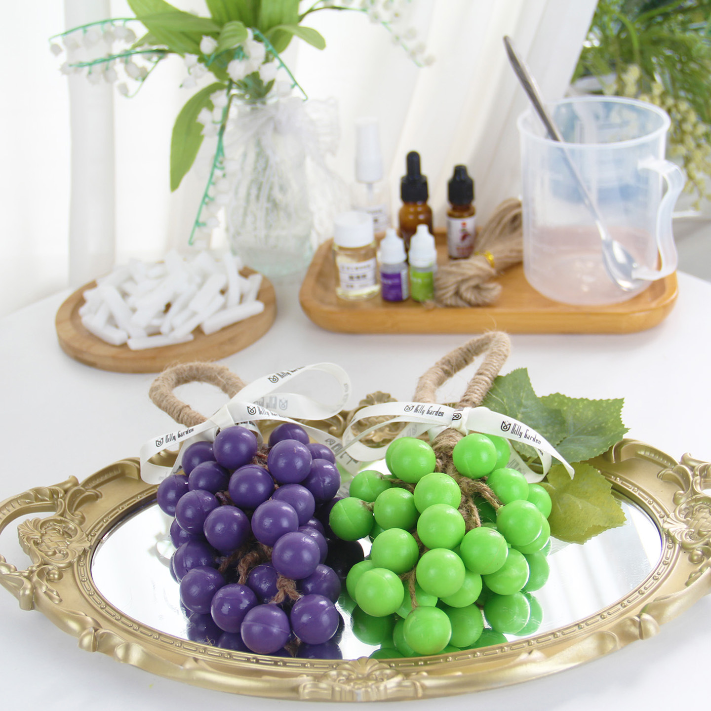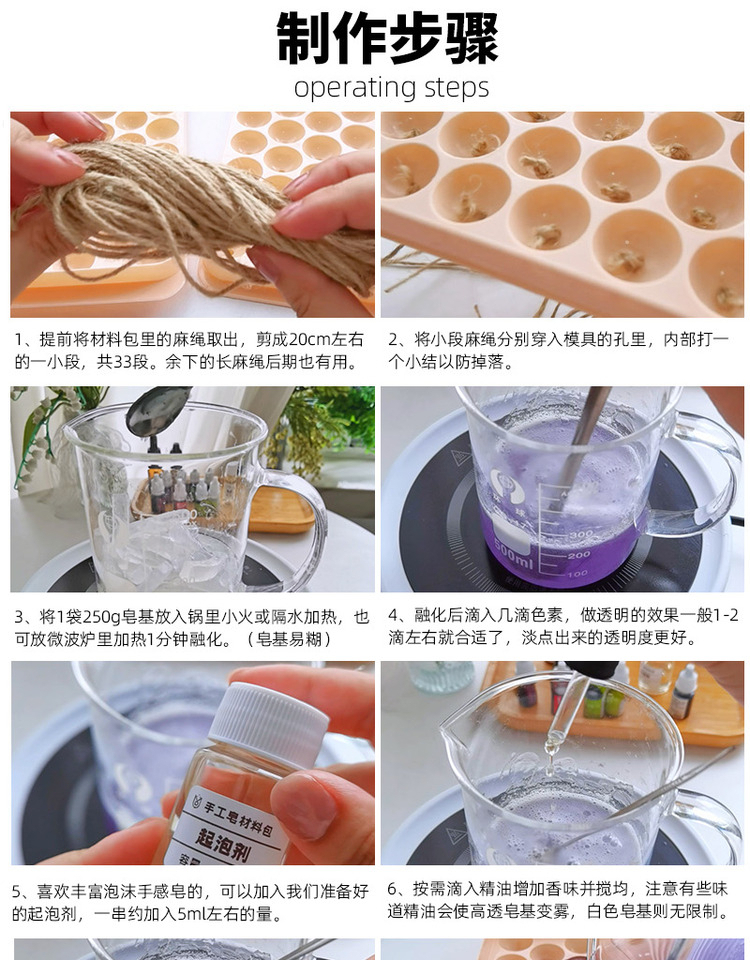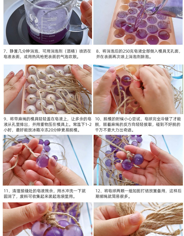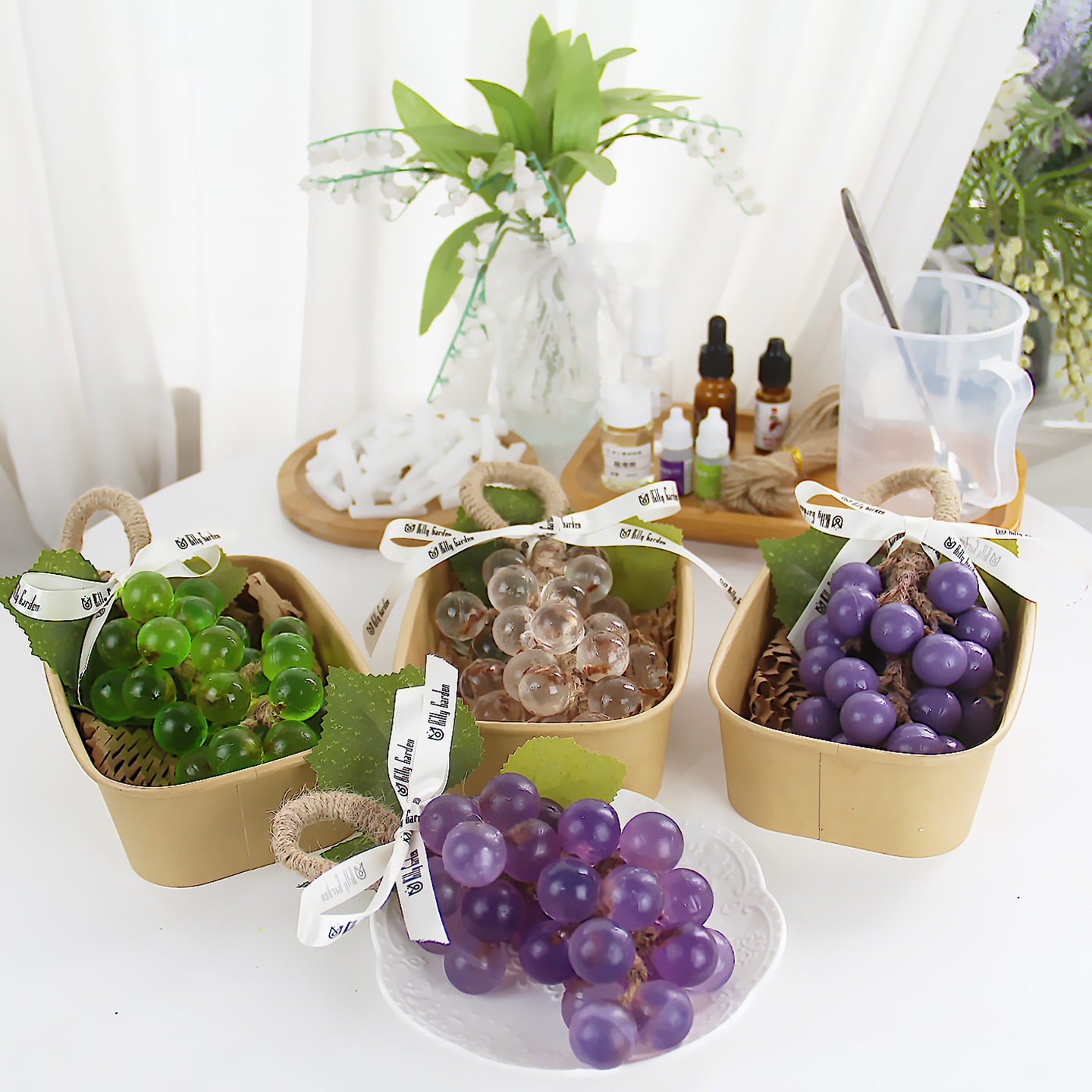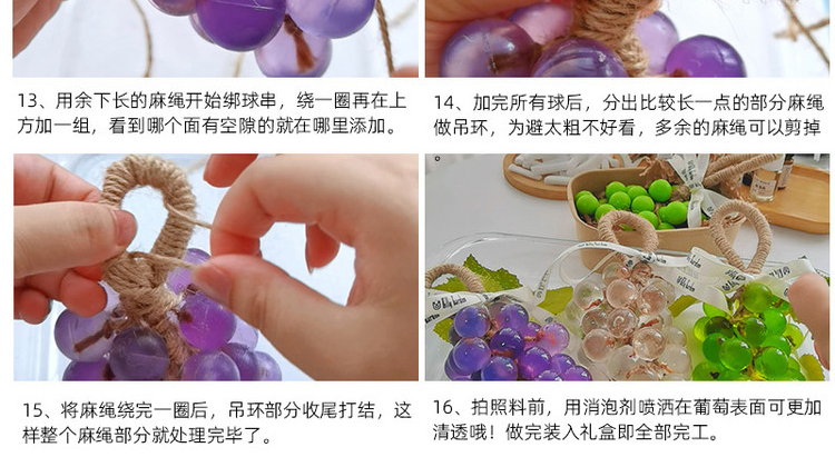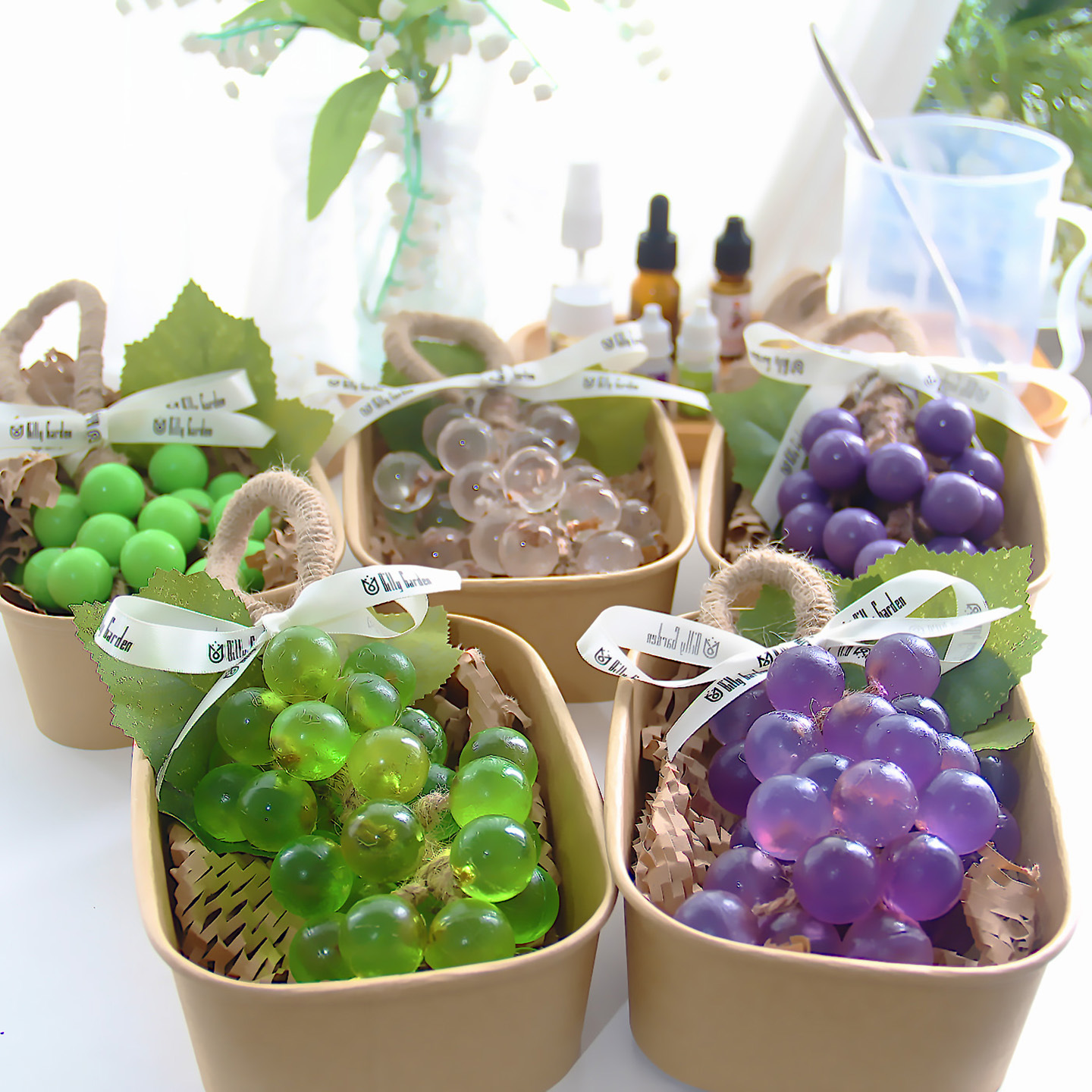 Из упаковки фиолетового винограда можно сделать 2 грозди.; Из упаковки зеленого винограда можно сделать 2 шампура.; Из прозрачной упаковки из винограда можно сделать 2 грозди.; Из прозрачной зеленой упаковки можно сделать 2 шампура.; Высокопрозрачная упаковка из мыльного материала может состоять из 2-х нитей.; Водонепроницаемый плавящийся набор из трех предметов без плиты; Водонепроницаемый плавящийся набор из четырех предметов.; 33 формы для винограда; Квадратная подарочная коробка из воловьей кожи; Прозрачная мыльная основа 250г.; Белая мыльная основа 250г.; Высокопрозрачная мыльная основа 250г.; Овальная толстая подарочная коробка; Хлопковая веревка 10m (по умолчанию цвет верблюжий)