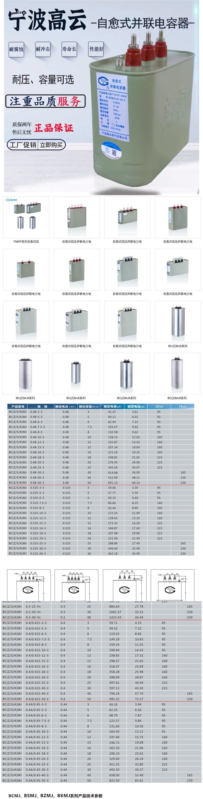 Конденсатор Ningbo Gaoyun BCMJ0.44-30-3/20/40/15 самовосстанавливающийся низковольтный параллельный силовой конденсатор