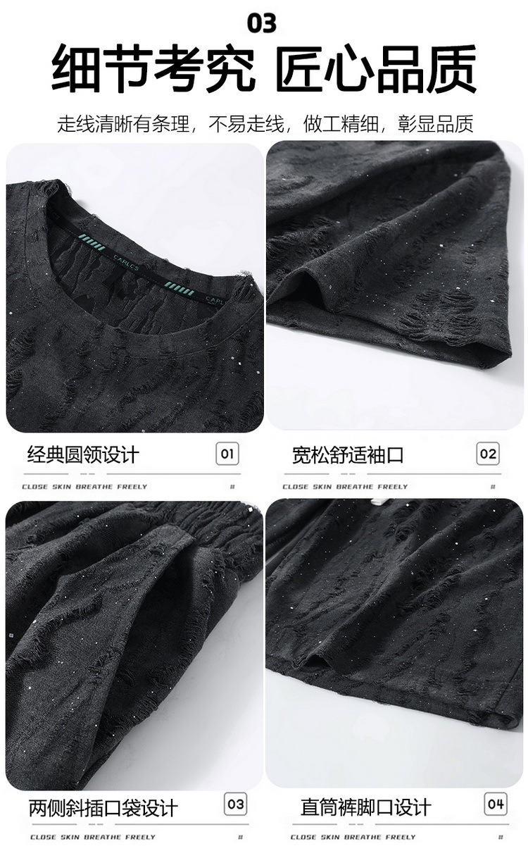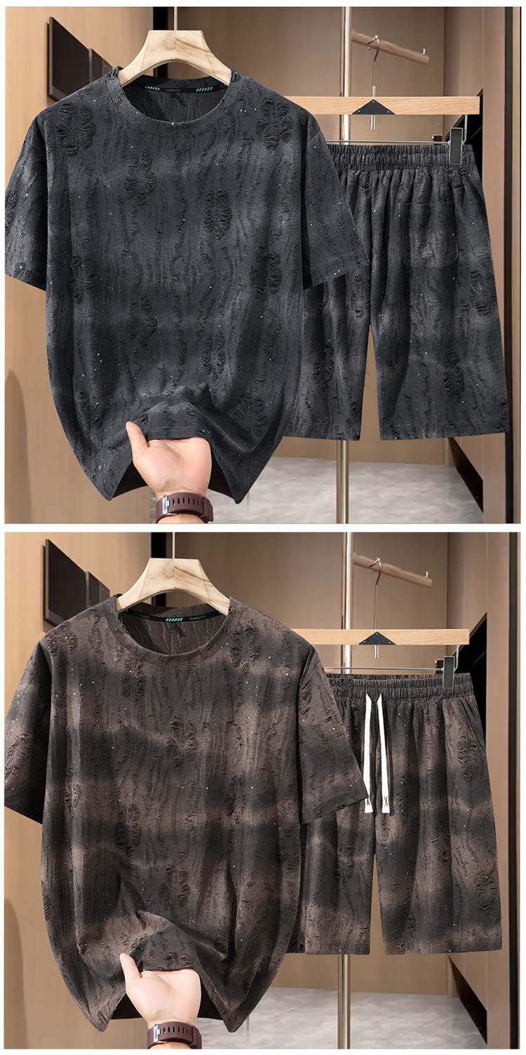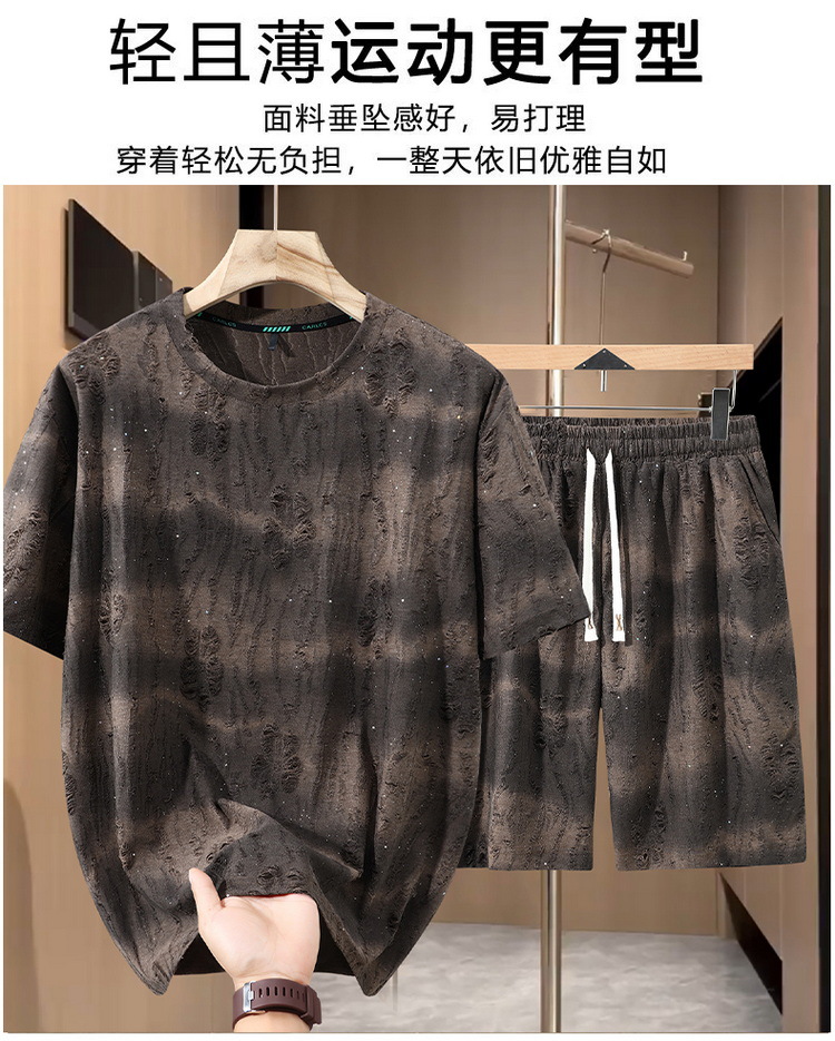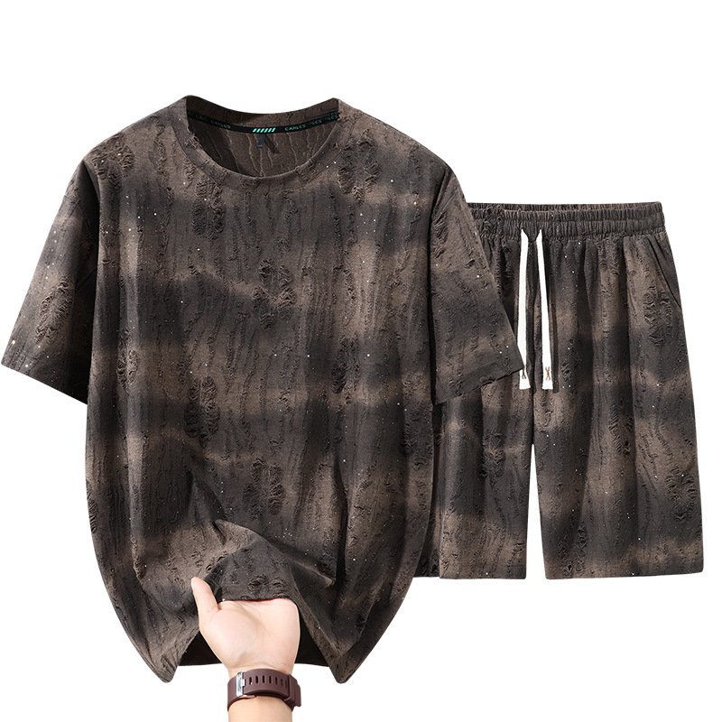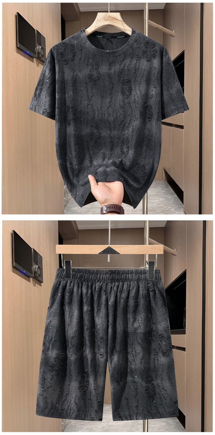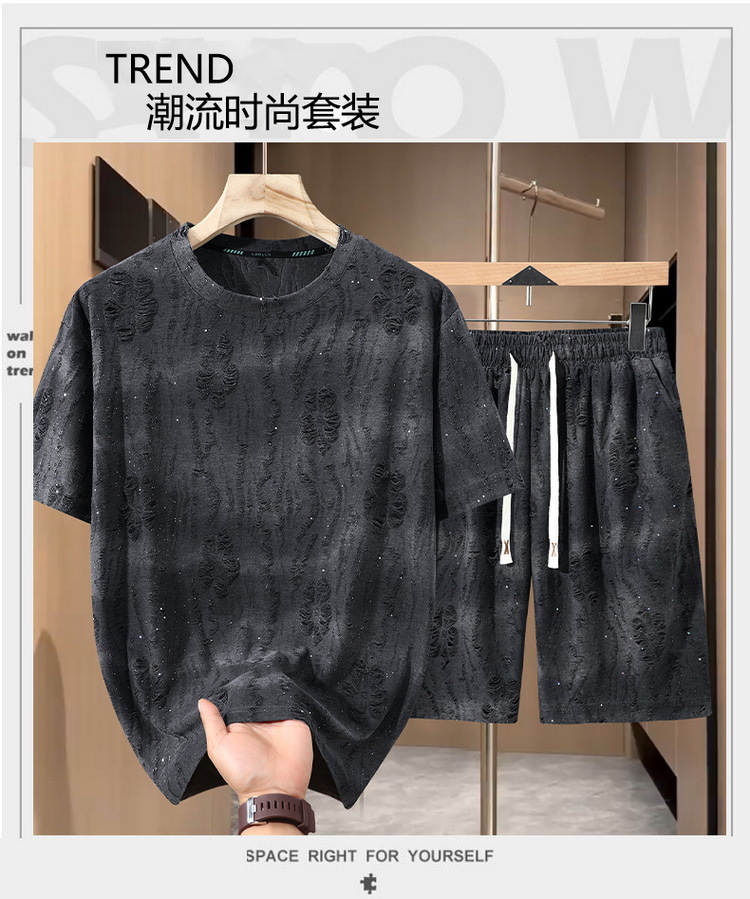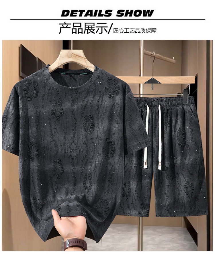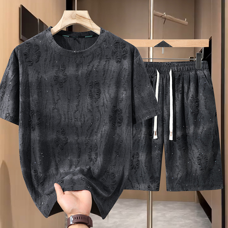 Очень большой размер 150kg летний мужской костюм больших размеров с половиной рукавов рваный круглый вырез футболка с короткими рукавами шорты комплект из двух предметов