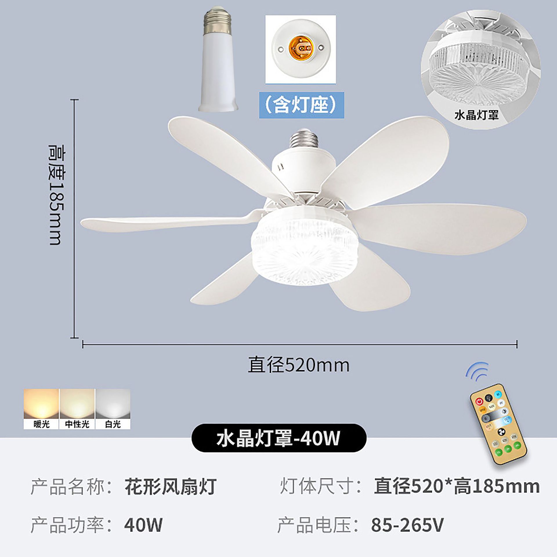 40W520 Набор для Великобритании (включает основание, удлинительный стержень и адаптер B22); Универсальный белый абажур с 6 лопастями, 40 Вт, удлинённая штанга 520 мм; Универсальный белый абажур с 6 лопастями, 40 Вт, с удлиненным основанием 520 мм; Глобальный стандарт: черный светильник с 6 лопастями, 30 Вт, черные лопасти вентилятора длиной 420 мм; Глобальный универсальный 6-лопастной черный резак 40W520 мм с удлинительным стержнем 95 мм; 30-ваттный небольшой пульт дистанционного управления без аксессуаров; 40-ваттный небольшой пульт дистанционного управления без аксессуаров; Глобальный универсальный черный вентилятор с 6 лопастями, мощностью 40 Вт, диаметром 520 мм, с удлинительной штангой 95 мм и основанием.; Глобальный нейтральный 6-лопастный черный вентилятор с кристаллическим абажуром, мощность 40 Вт, диаметр 520 мм, с большим пультом дистанционного управления, без комплектующих.; Универсальный белый абажур с 6 лопастями, 30 Вт, диаметр 420 мм; Глобальный универсальный белый абажур с 6 лопастями, 30 Вт, диаметр 420 мм, удлинённый стержень; Глобальный нейтральный белый абажур с 6 лопастями, мощность 30 Вт, диаметр 420 мм, цветные лопасти вентилятора; Глобальный универсальный белый абажур с 6 лепестками, 40 Вт, 520 мм, без удлинительной стойки; Глобальный нейтральный 6-лопастной белый абажур, 40 Вт, 520 мм, цветные лопасти вентилятора с большим пультом дистанционного управления, без аксессуаров; Глобальный универсальный 6-лопастной цветной удлинительный стержень мощностью 40 Вт и длиной 520 мм; Глобальная универсальная 6-лопастная кристальная крышка [40 Вт] + большой белый пульт дистанционного управления + патрон для лампы; Глобальная универсальная 6-лопастная кристальная крышка [40 Вт] + компактный золотой пульт дистанционного управления; Глобальная универсальная 6-лопастная кристальная крышка [40 Вт] + компактный золотой пульт дистанционного управления + патрон для лампы; Глобальный универсальный вентилятор с 6 лопастями и кристаллическим абажуром [40 Вт] + большой белый пульт дистанционного управления + удлиненная штанга для светильника; Глобальная универсальная 6-лопастная кристальная крышка [цветные листья 40 Вт] + большой белый пульт дистанционного управления + патрон для лампы; Глобальная универсальная модель с кристаллическим покрытием на 6 лопастях [цветные листья 40 Вт] + большой белый пульт дистанционного управления; Глобальная универсальная кристальная крышка с 6 лопастями [40 Вт] + большой белый пульт дистанционного управления; Глобальная нейтральная лампа с 6 лепестками, черным корпусом и хрустальным плафоном, мощность 40 Вт, диаметр 520 мм; Полный комплект аксессуаров британского стандарта; Удлинитель E27 по 95 мм каждый; Одна база Е27.; B22 до E27 один; Большой белый пульт дистанционного управления не включает одну батарею.; В маленьком золотом пульте дистанционного управления находится одна батарейка.