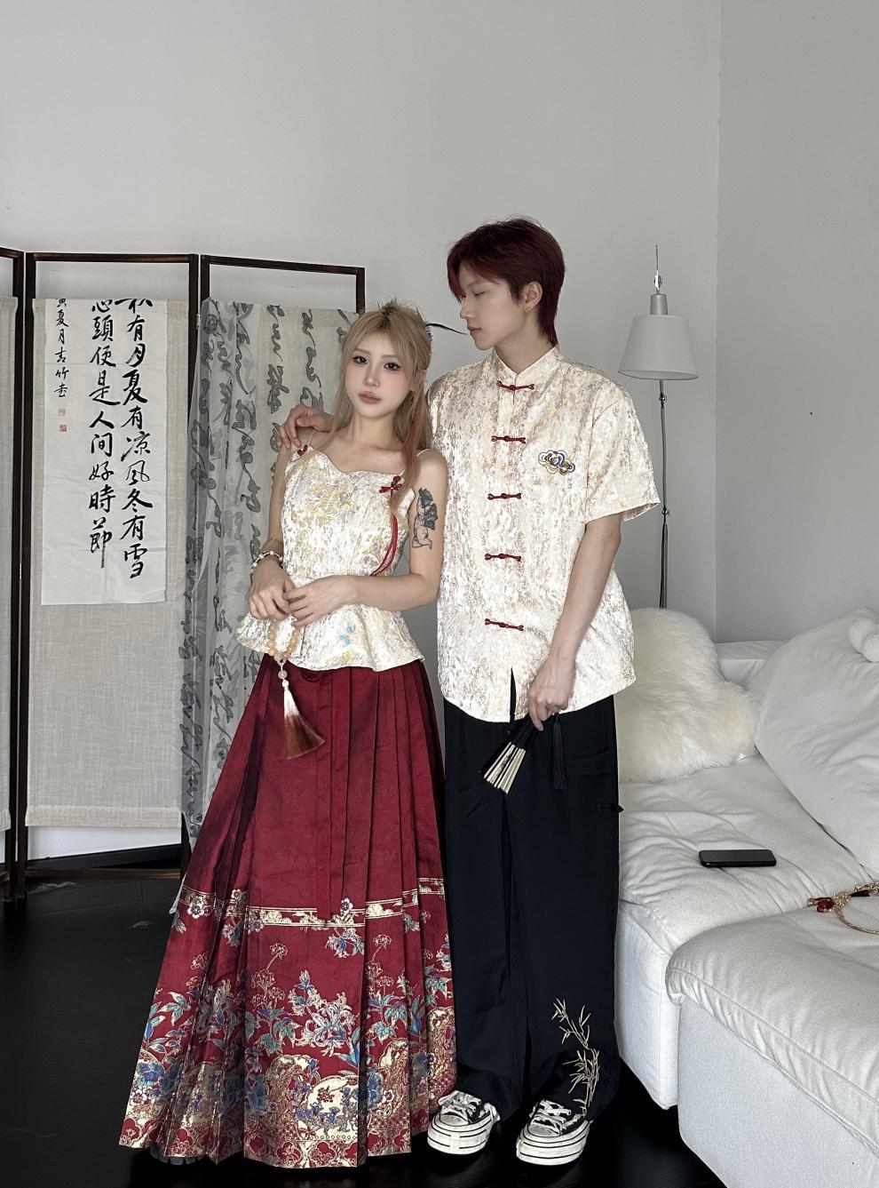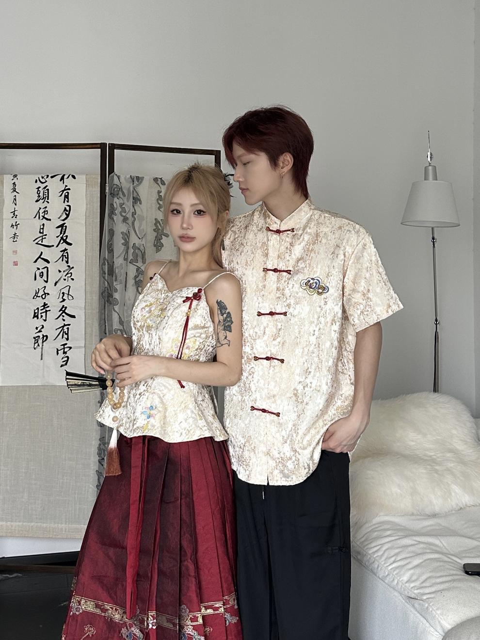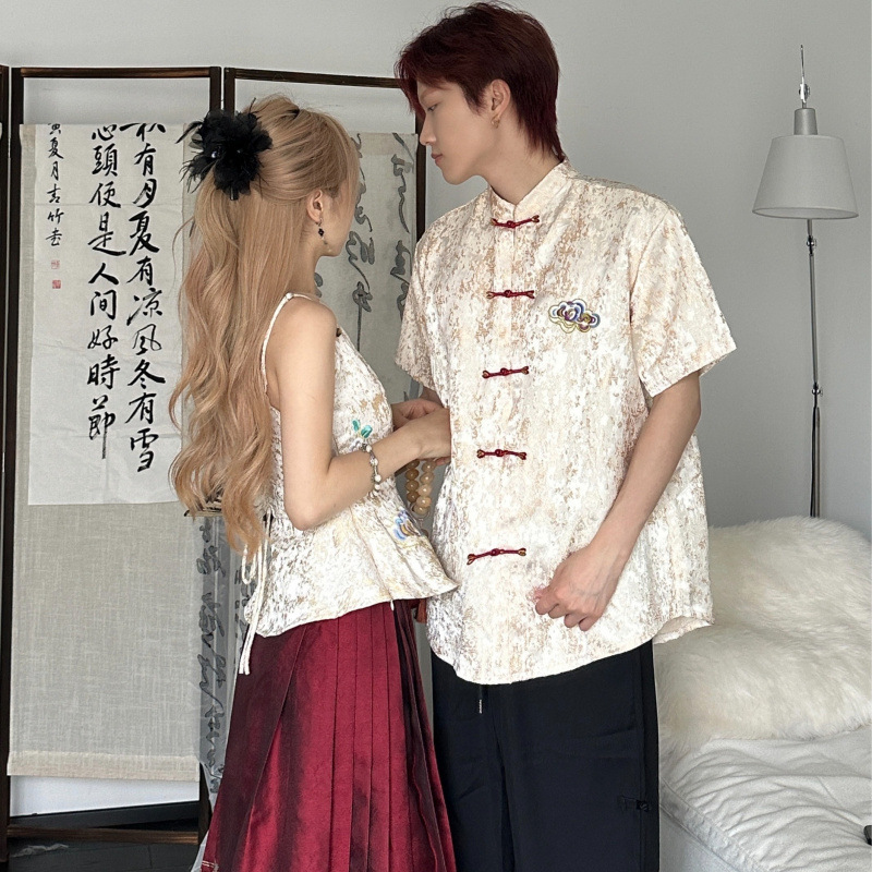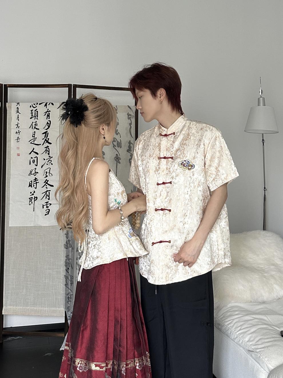 Летний костюм 2025 года в национальном стиле для пар: короткий рукав, классическая форма, юбка-клеш для мужчин и женщин