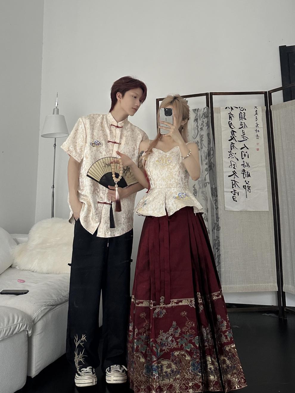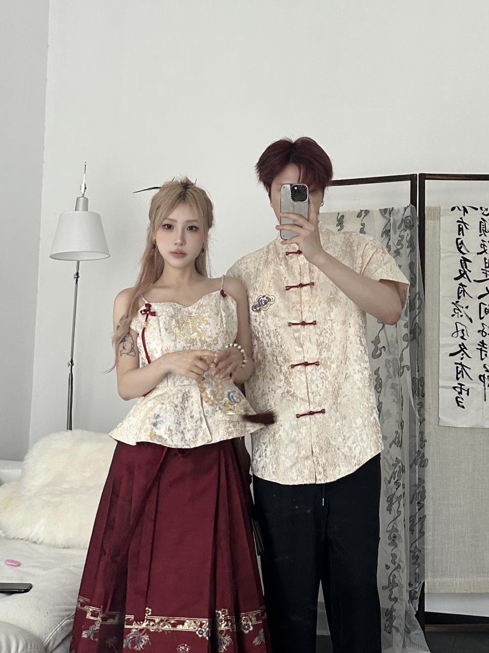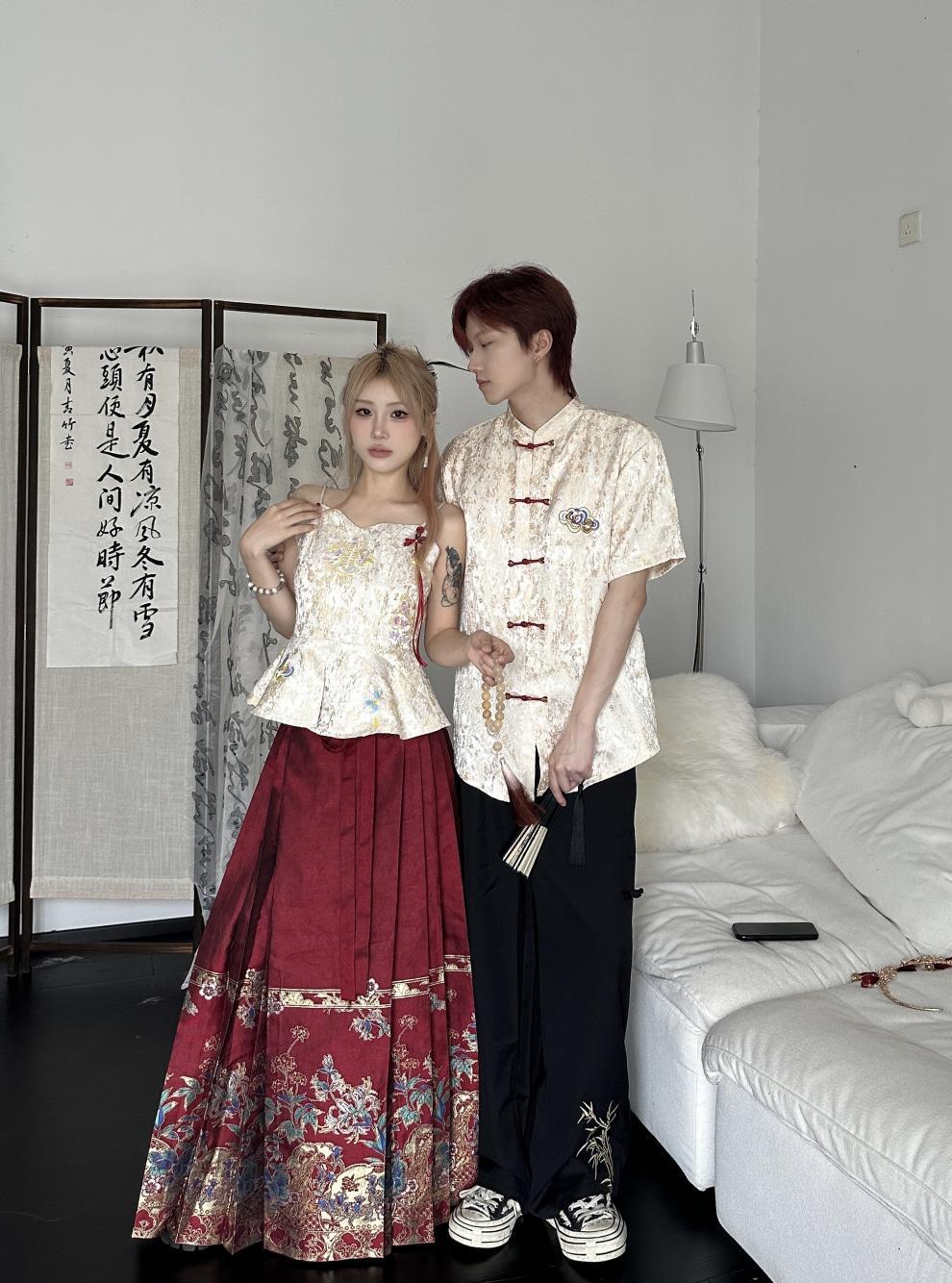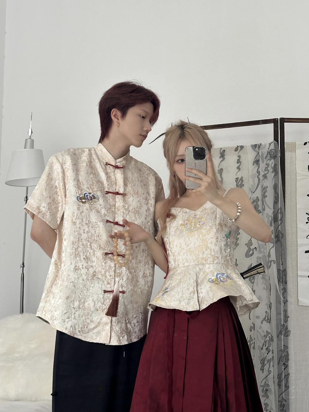 Летний костюм 2025 года в национальном стиле для пар: короткий рукав, классическая форма, юбка-клеш для мужчин и женщин