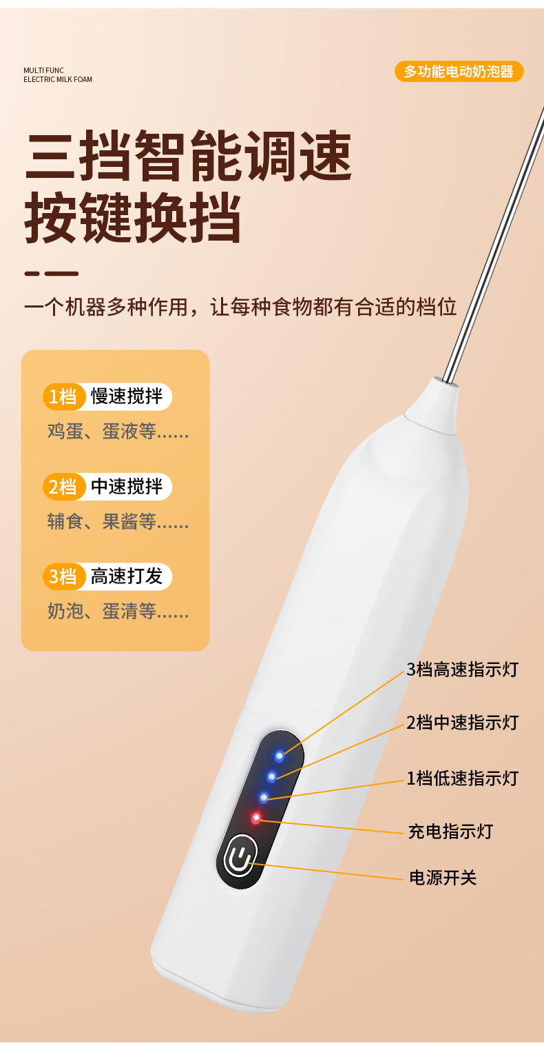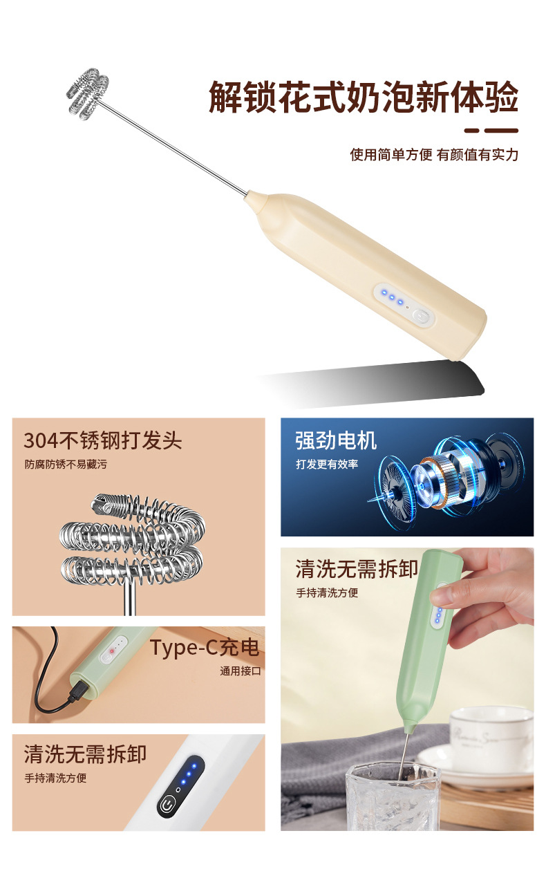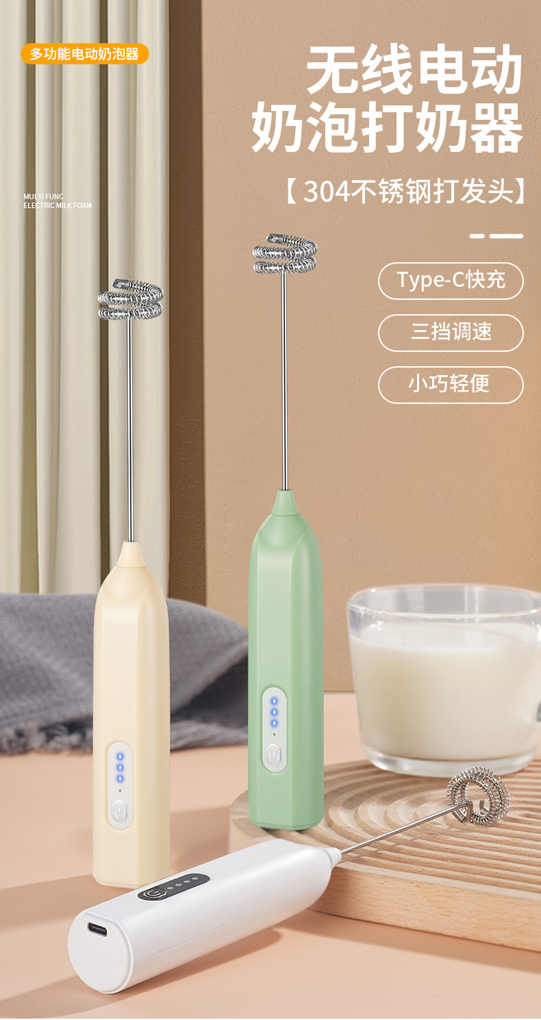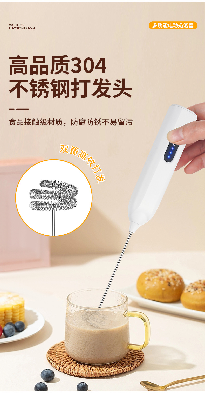 Электрический вспениватель молока и взбиватель яиц JLL7602, экологически чистая нержавеющая сталь 304, трехскоростная функция регулировки мощности, зарядка типа C