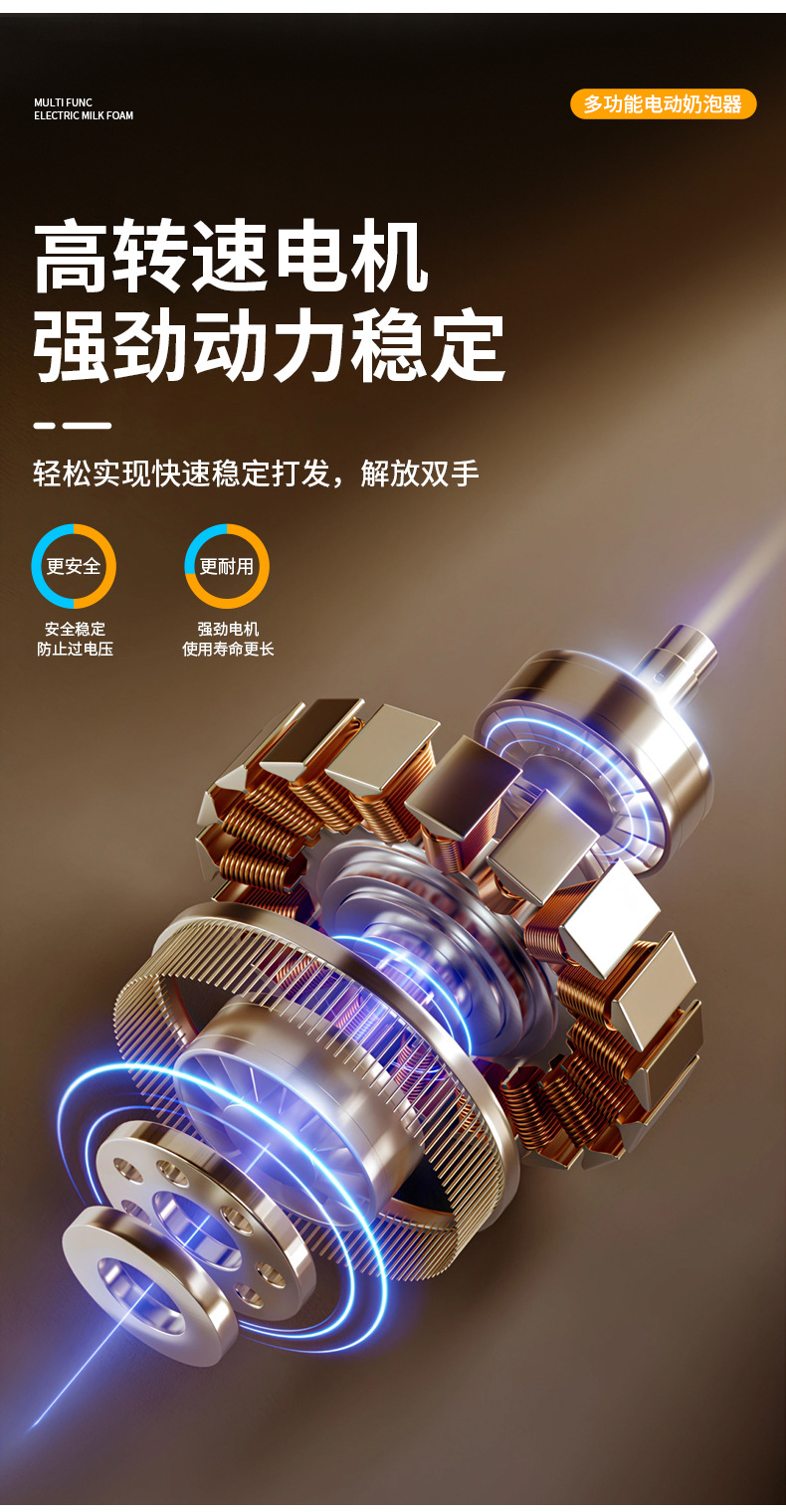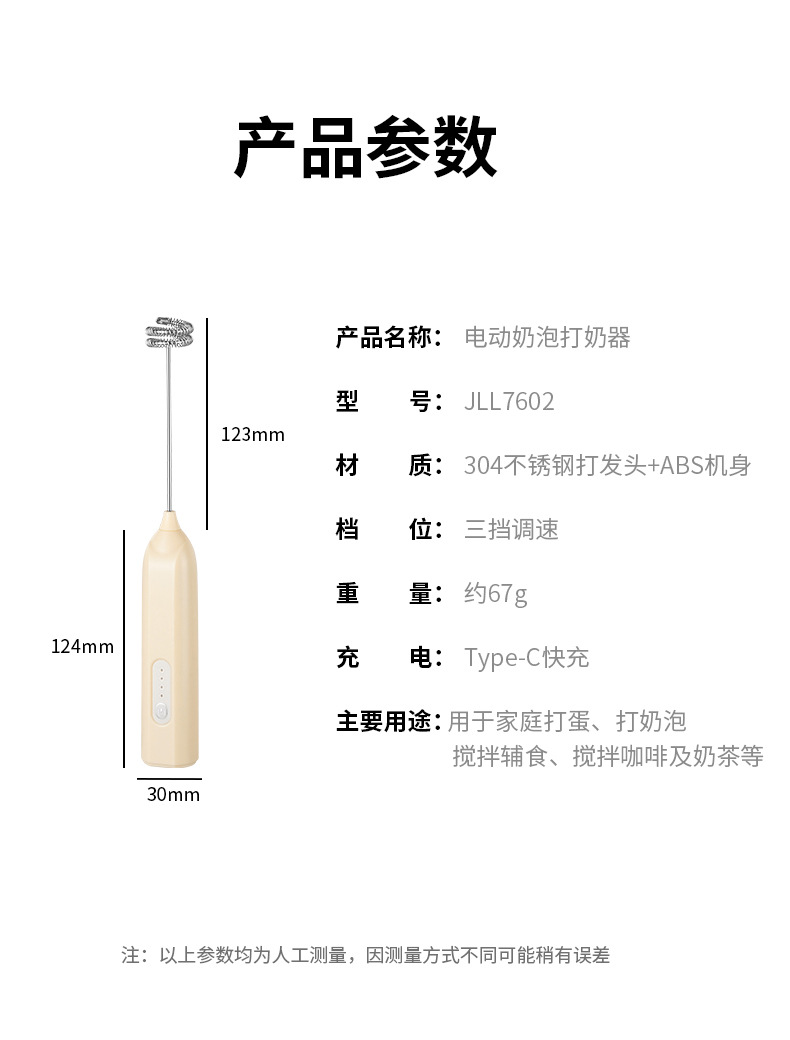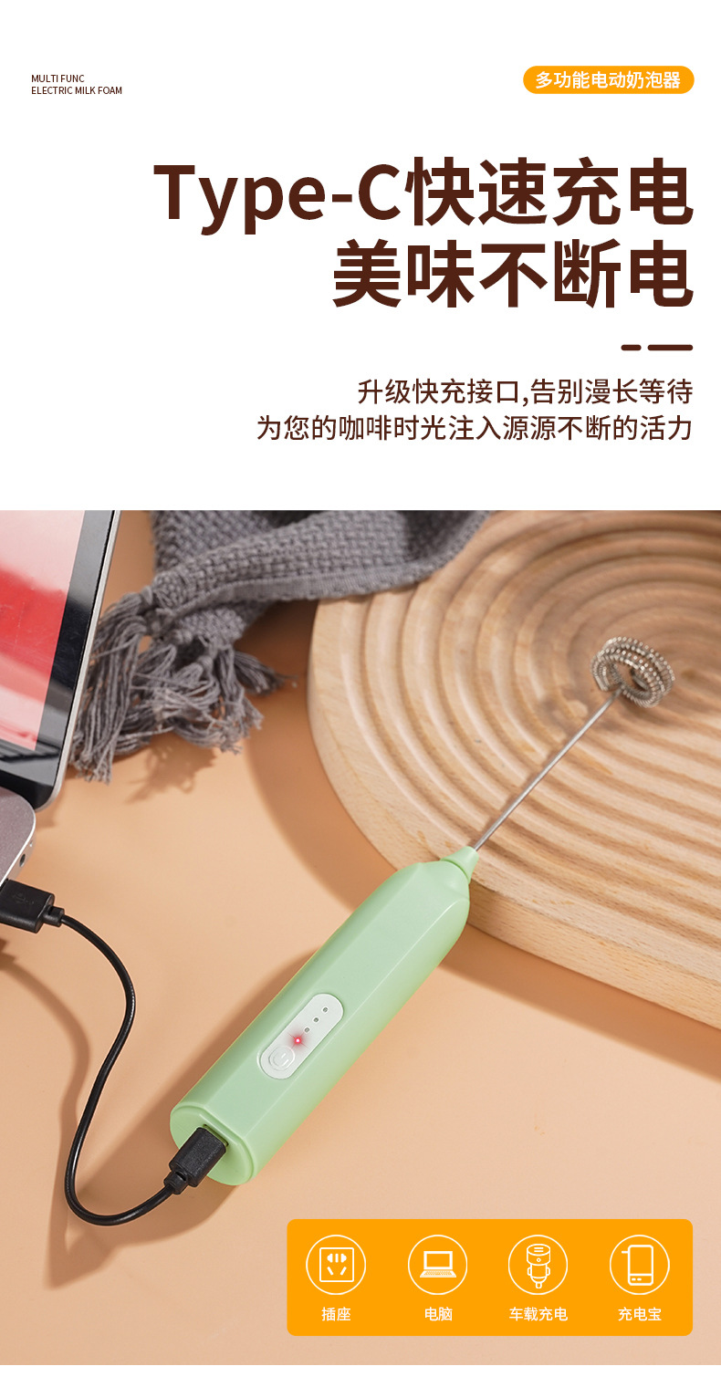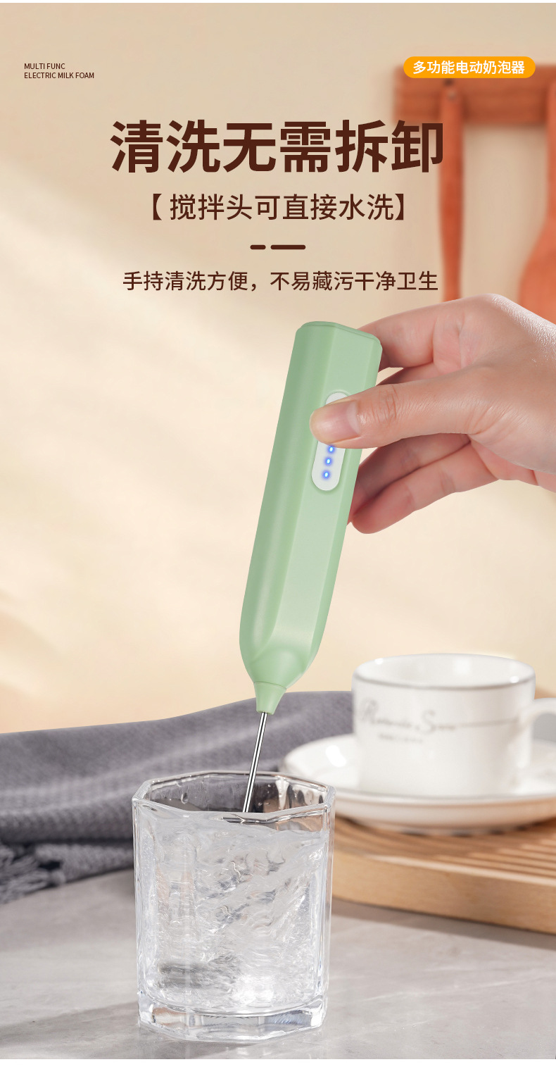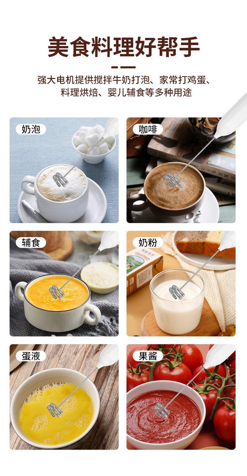 Электрический вспениватель молока и взбиватель яиц JLL7602, экологически чистая нержавеющая сталь 304, трехскоростная функция регулировки мощности, зарядка типа C