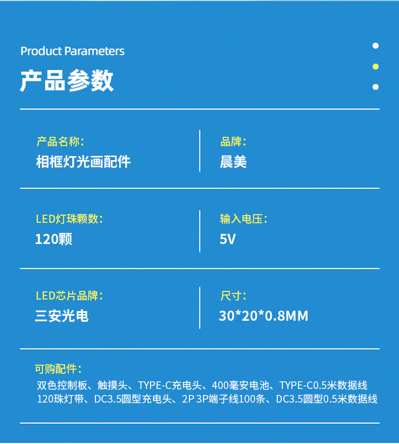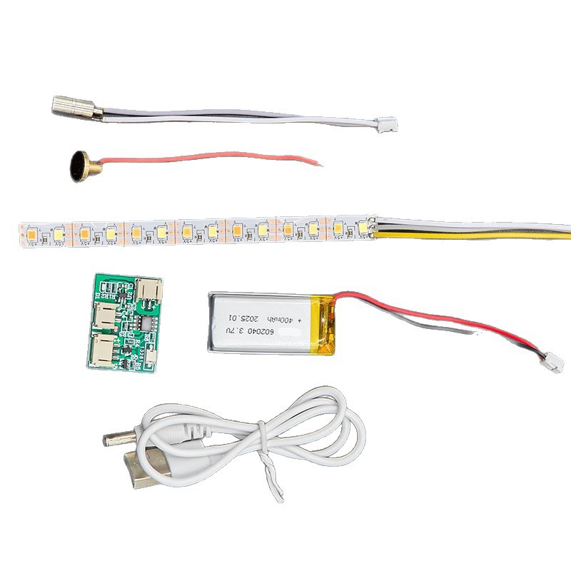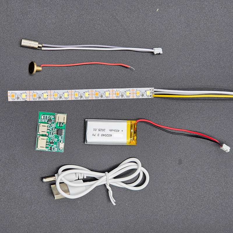 Двухцветная панель управления; прикоснуться к голове; Зарядная головка Type-c; Аккумулятор емкостью 400 мАч; Type-c 0.5m кабель для передачи данных; Световая полоса из 0.62m бусин; Световая полоса из 1.12m бусин; Круглая зарядная головка DC3,5; DC3,5 круглый 0.5m кабель для передачи данных; 100 штук клеммных линий 2P; 100 штук клеммных линий 3P