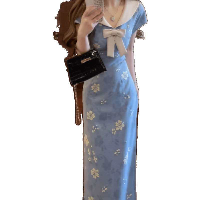 Новое синее платье-чонсам в китайском стиле с кукольным воротником, длинная юбка с завышенной талией