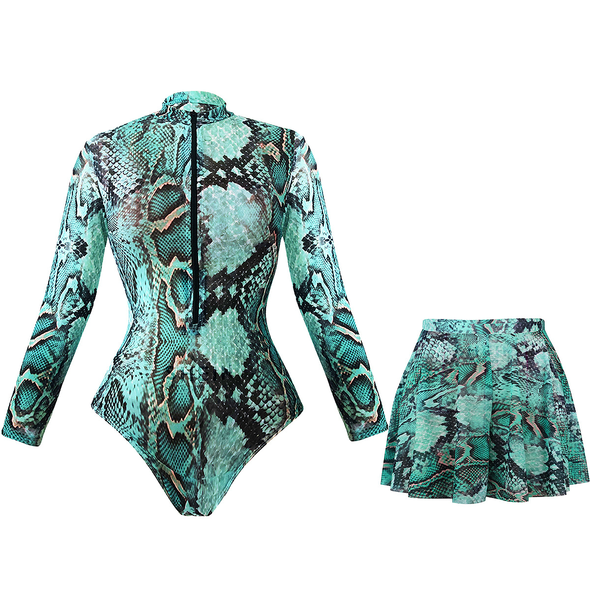 Синий комбинезон на молнии + юбка; Синий цельный купальник + юбка; Синий купальник с короткими рукавами + юбка; Коричнево-красный цельный купальник + юбка; Коричнево-красный купальник с короткими рукавами + юбка; Желтый цельный купальник + юбка; Зеленый купальник со змеиным принтом + юбка; Комбинезон на молнии коричневого и красного цвета + юбка; Красная сетчатая юбка; Зеленая сетчатая юбка с змеиным принтом; Синяя сетчатая юбка; Желтая сетчатая юбка; Фиолетовая юбка из сетки; Фиолетовый слитный купальник + юбка; Фиолетовый слитный купальник с молнией + юбка