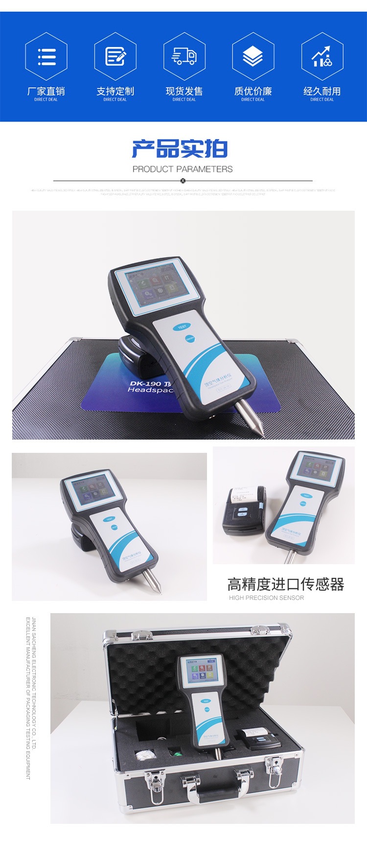 DK-190顶空气体分析仪采用全新手持式设计,配备进口传感器,可以准确、便捷的测定密封包装袋、瓶、罐 等中空包装容器中 O2含量; 通过选配传感器可测试CO2含量,N2含量。可让您快速、有效地测试气调包装,这是大批量品牌制造的必要条件。操作人员可以一眼看出气体成分是否在所需的水平之内。它还具有您所需要的可追溯性:每个包装的基本数据能存储在设备本身或传输到 DK-190软件或第三方软件中。