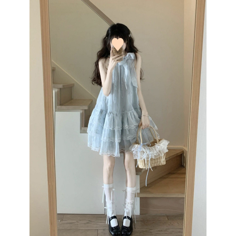 Летнее платье для женщин с бантом, без рукавов, на бретелях, с воротником-халтер, кружевное, пышное, в стиле принцессы