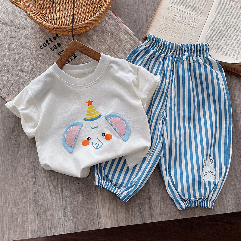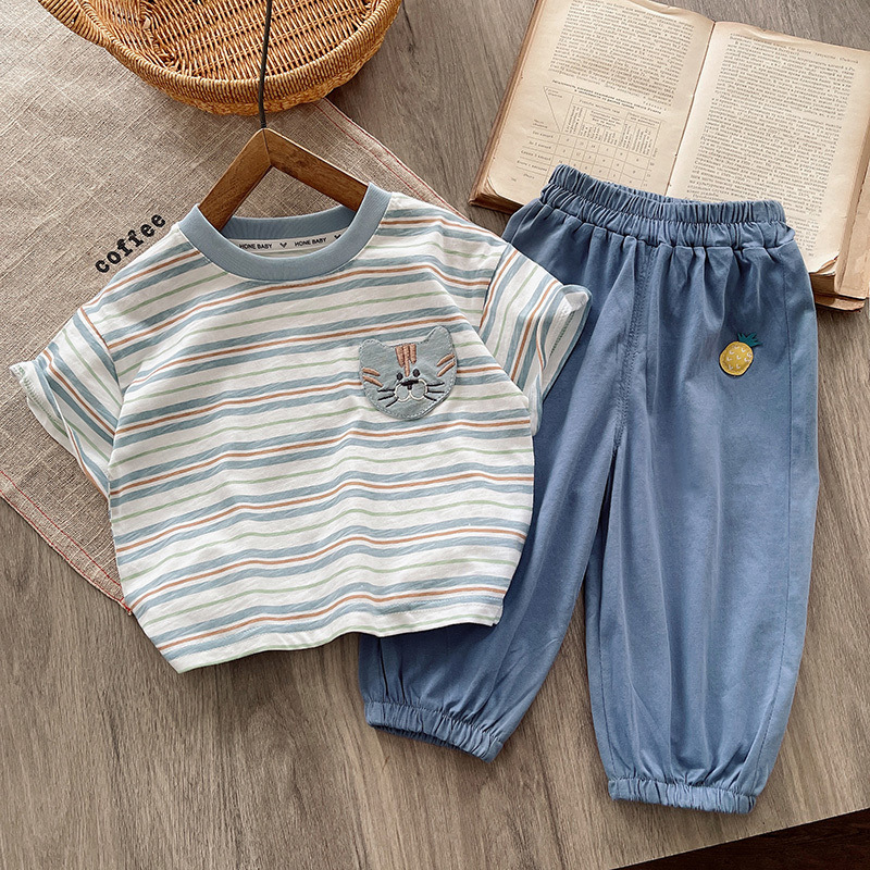 Детский летний костюм 2025 года для мальчиков: стильный, модный, тонкий, с коротким рукавом, полосатый, с защитой от комаров, штаны-фонарики.