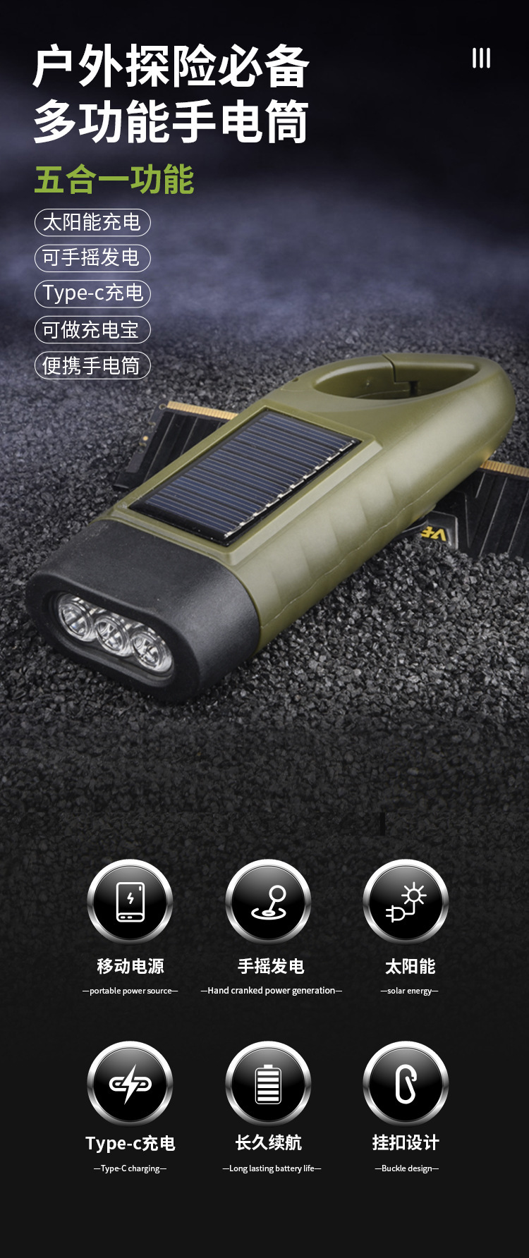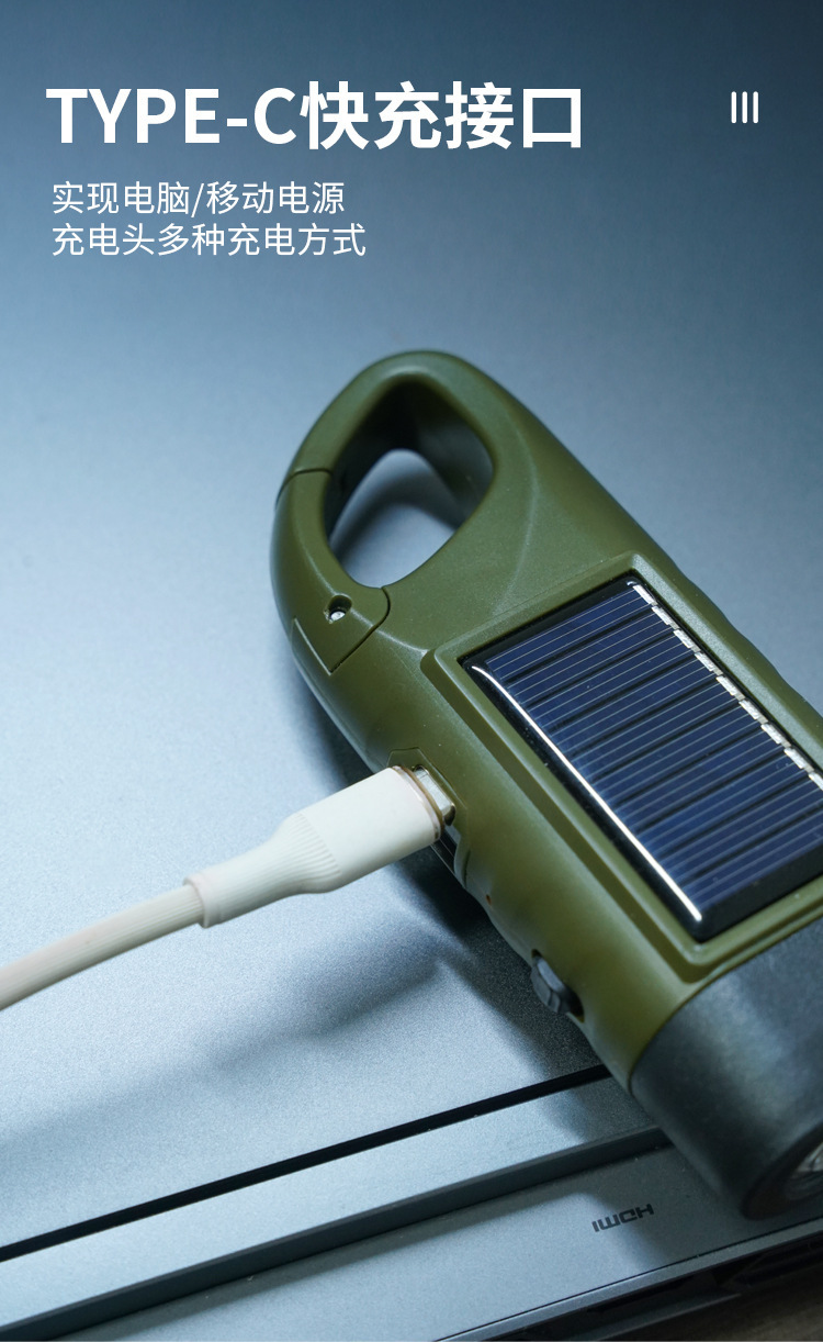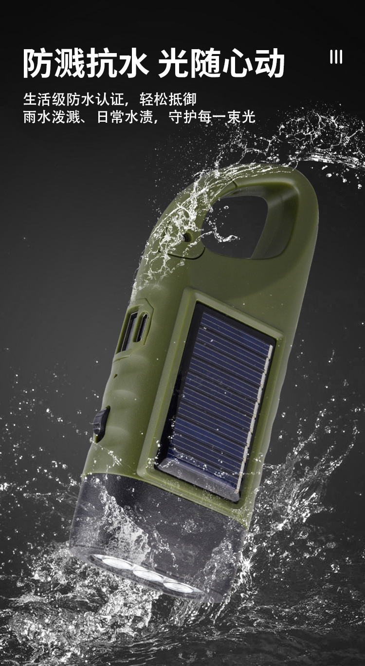 产品本身是靠太阳能+手摇两种方式充电手摇一分钟大约可亮8分钟