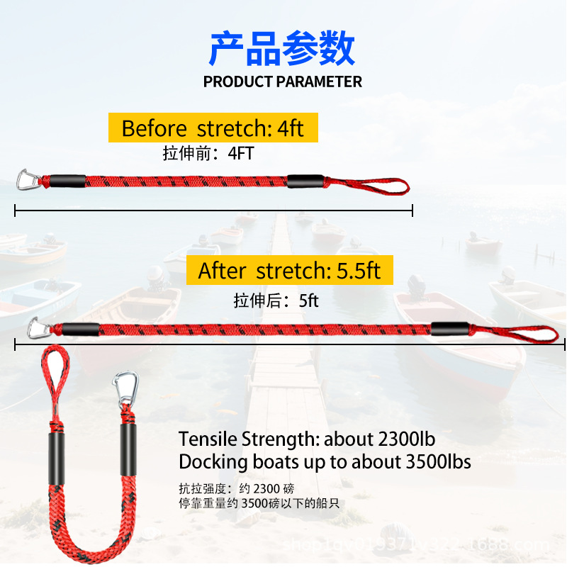 可伸缩便捷规格:常规长度 4 英尺(1.2 米),弹性拉伸后可达 5.5 英尺(1.68 米),适配大多数码头与船体的间距,无需用力拖拽船只即可轻松完成上下船操作,老人、儿童也能轻松掌控