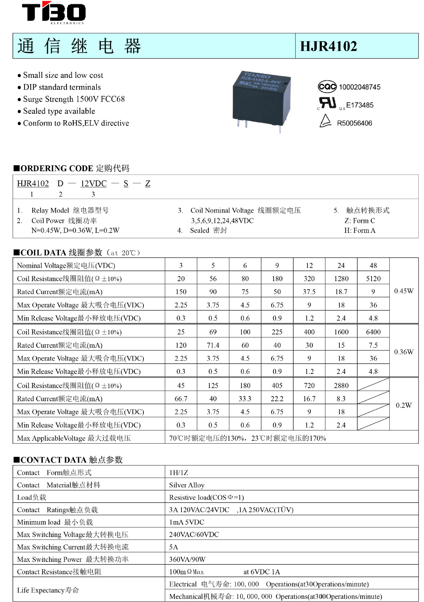 Реле TIANBO Tianbo HJR-4102-L-05V 12 В 24 В постоянного тока 6 футов 3A120 В переменного тока, один открытый и один закрытый