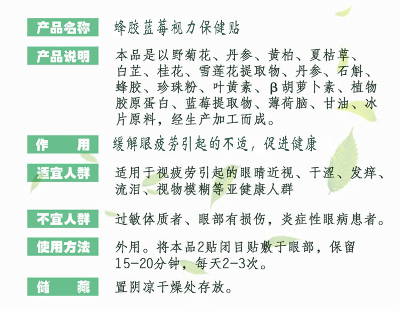 Сделано из таких ингредиентов, как дикая хризантема, шалфей красный (Salvia miltiorrhiza), амурский коричный (Phellodendron amurense), горечавка обычная (Prunella vulgaris), дудник даурский (Angelica dahurica), прополис, жемчужный порошок, борнеол и экстракт черники.