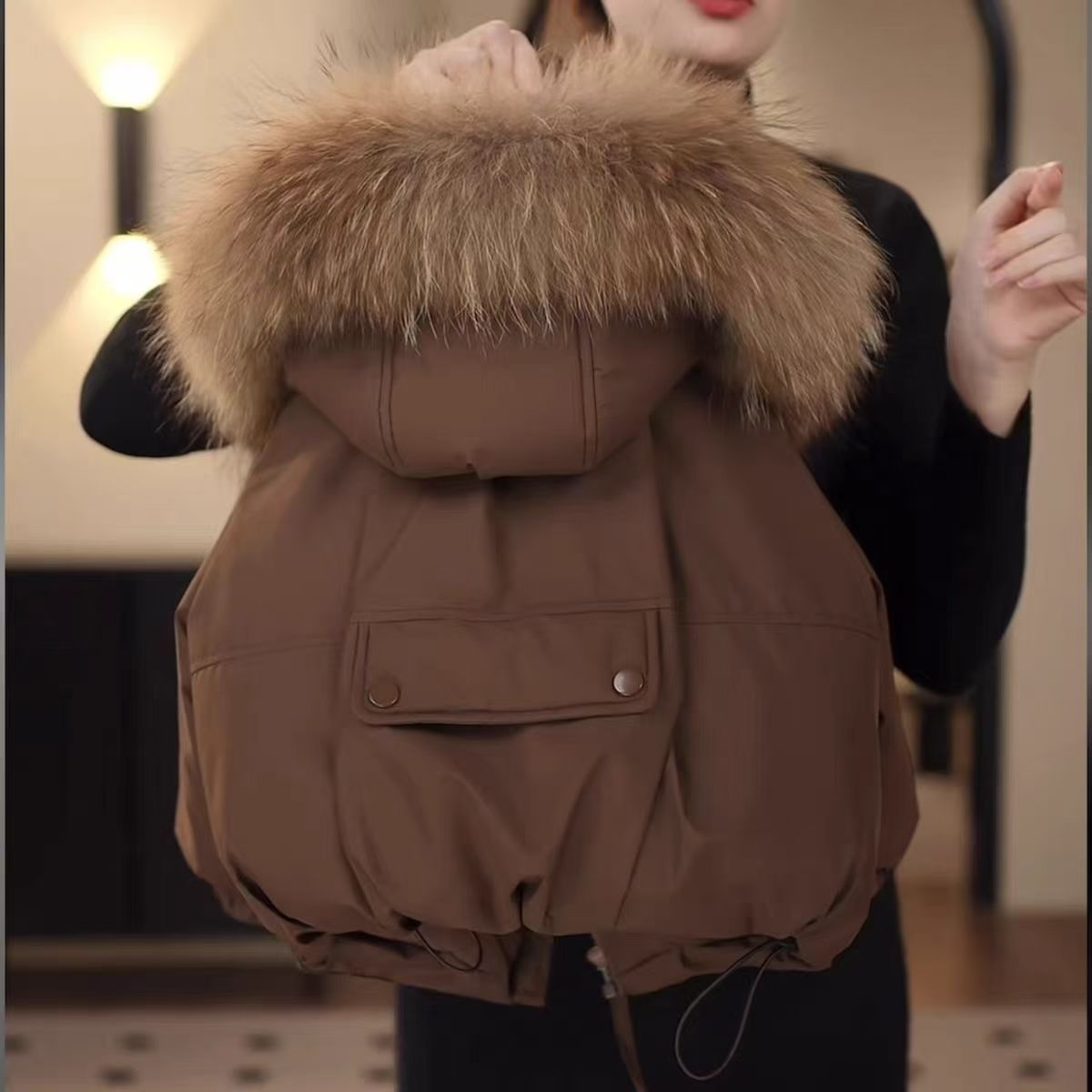 Хлопковое пальто с коричневым меховым воротником; Хлопковое пальто с красным меховым воротником