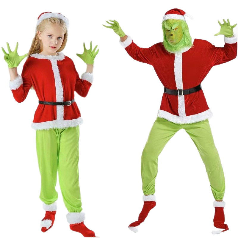 Европейская и американская рождественская одежда для взрослых и детей, костюм зеленоволосого монстра Гринча, маска, капюшон, праздничный костюм