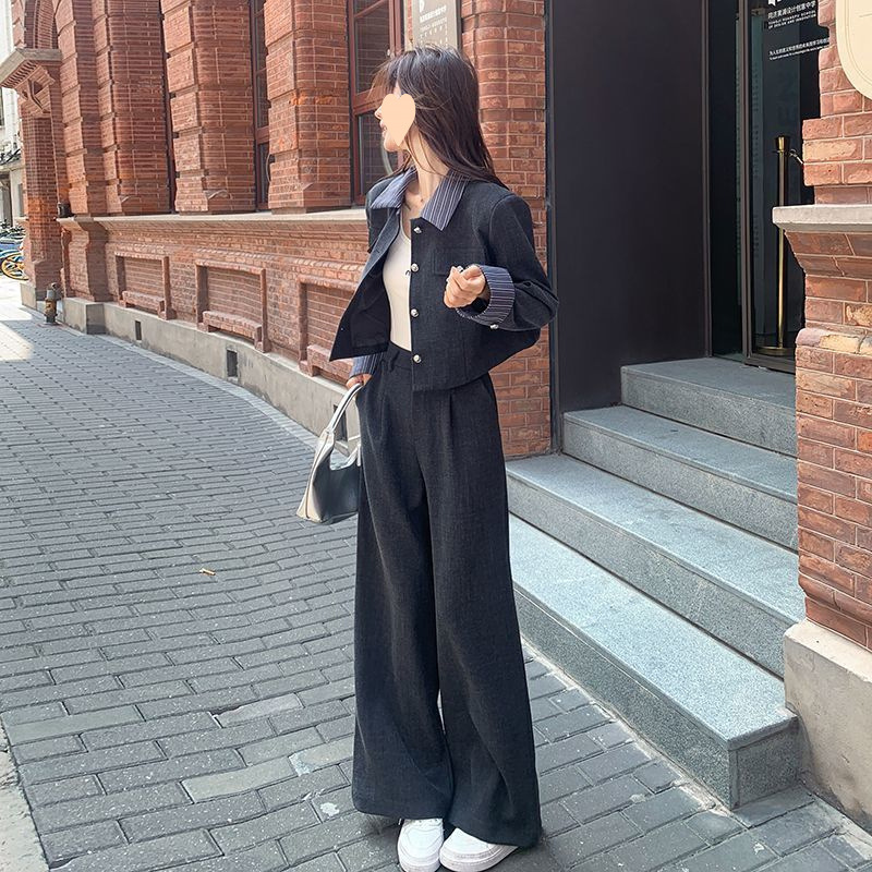 Серый костюм для женщин 2025 новый весенний комплект с элегантным широкими брюками, двухсоставной набор