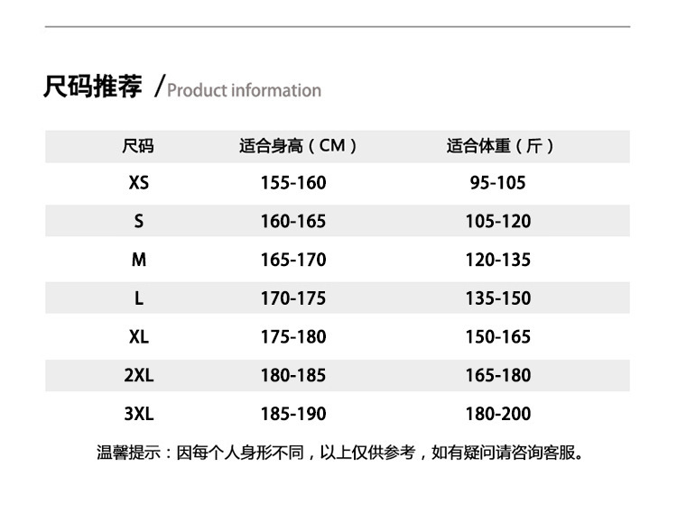 XS [рекомендуется 45-55kg ]; S [Рекомендация 55-65kg ]; М【Рекомендация 65-75kg】; L【Рекомендация 75-85kg】; XL [рекомендуется 85-95kg ]; 2XL [рекомендуется 95-105kg ]; 3XL [рекомендуется 105-115kg ]