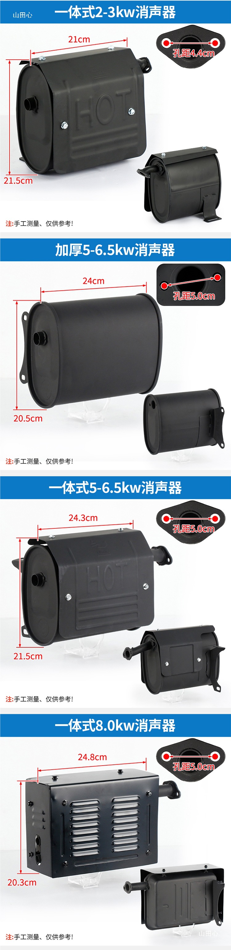 Глушитель 2-3кВт + кронштейн; Утолщенный глушитель мощностью 2-3 кВт.; Встроенный глушитель мощностью 2–3 кВт.; Утолщенный глушитель мощностью 5-8 кВт.; Встроенный глушитель мощностью 5–6,5 кВт.; Встроенный глушитель мощностью 8 кВт.; Колено глушителя 5-8 кВт [10 см]; Кронштейн глушителя 2-3 кВт