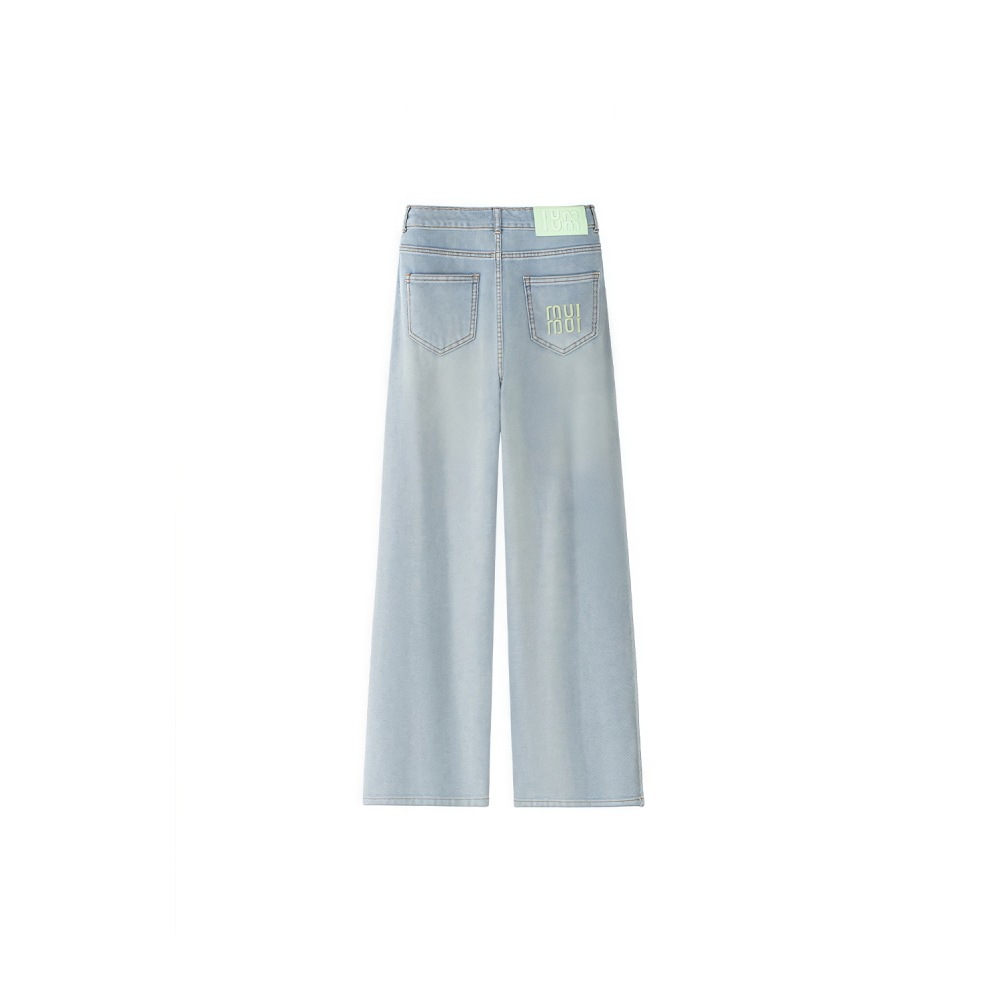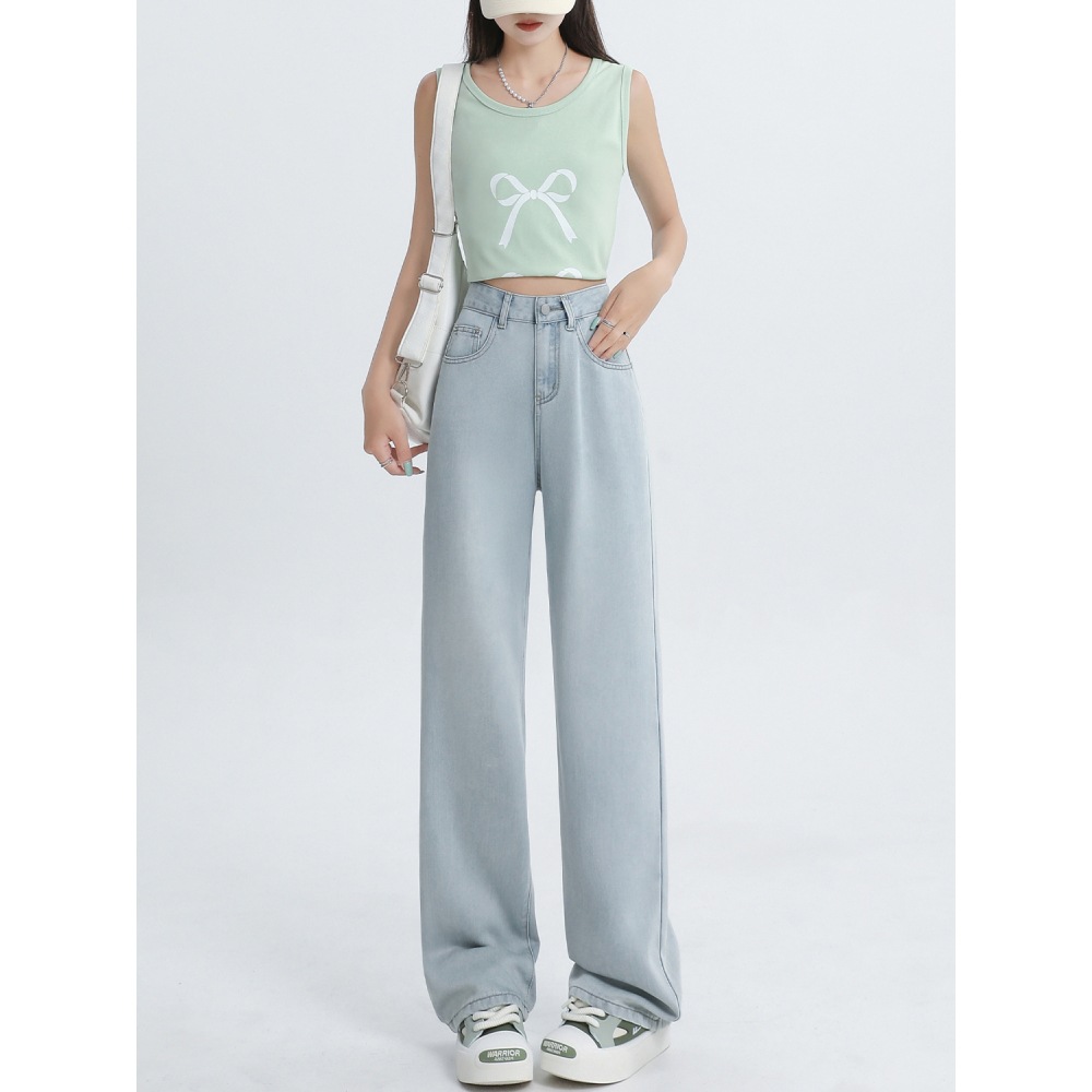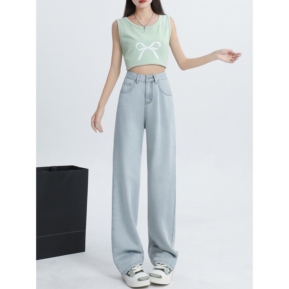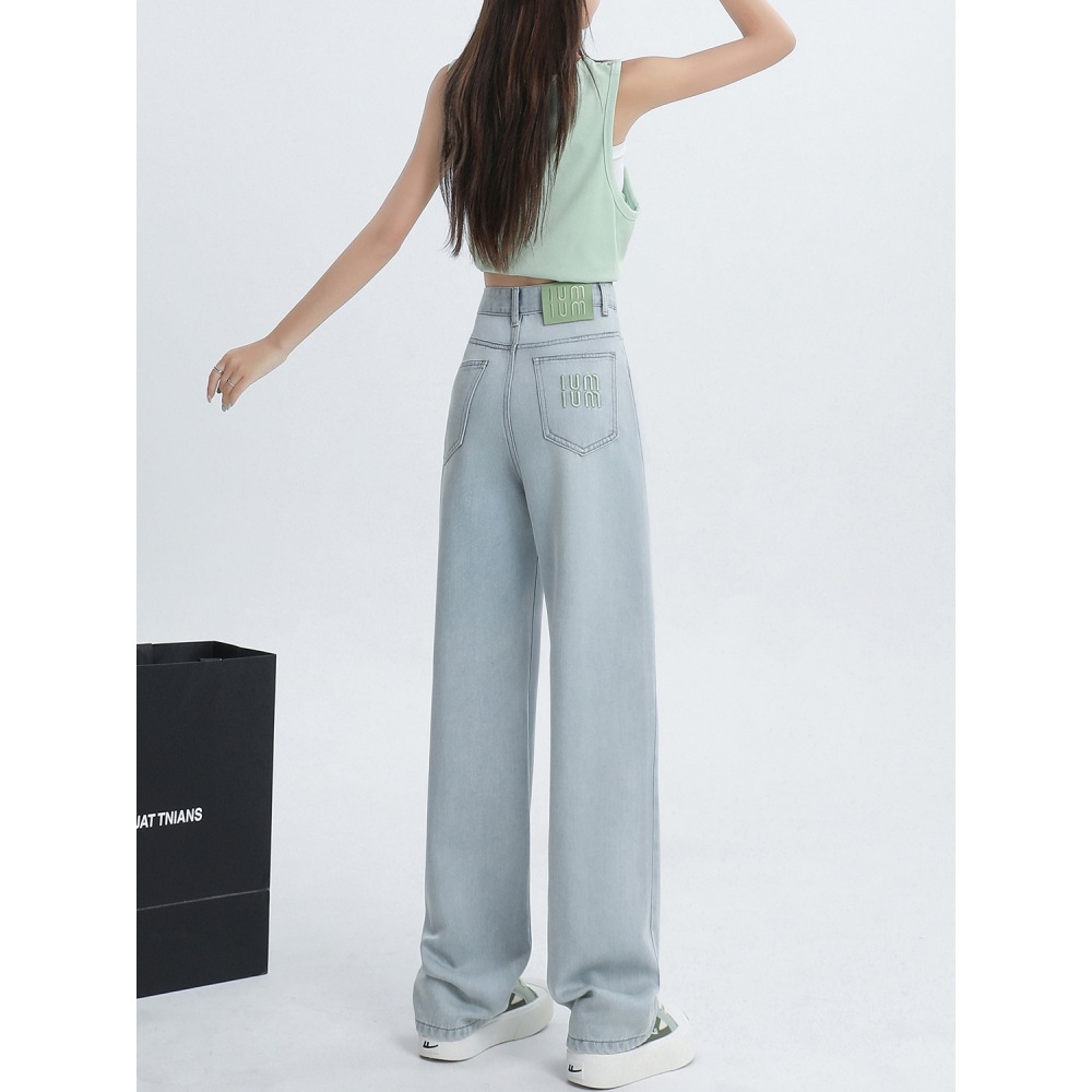 Светло-голубые прямые джинсы с вышивкой из тенселя для женщин, летние тонкие широкие брюки из ледяного шелка с высокой талией и драпировкой для полных девушек
