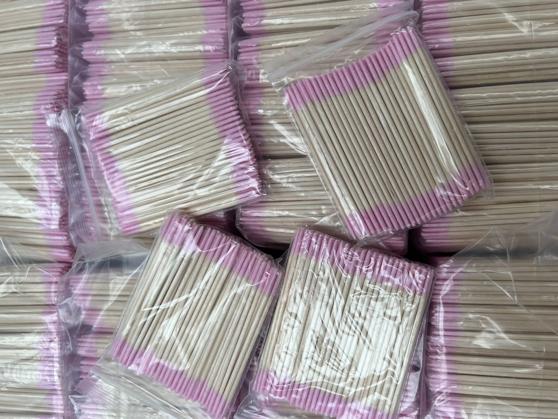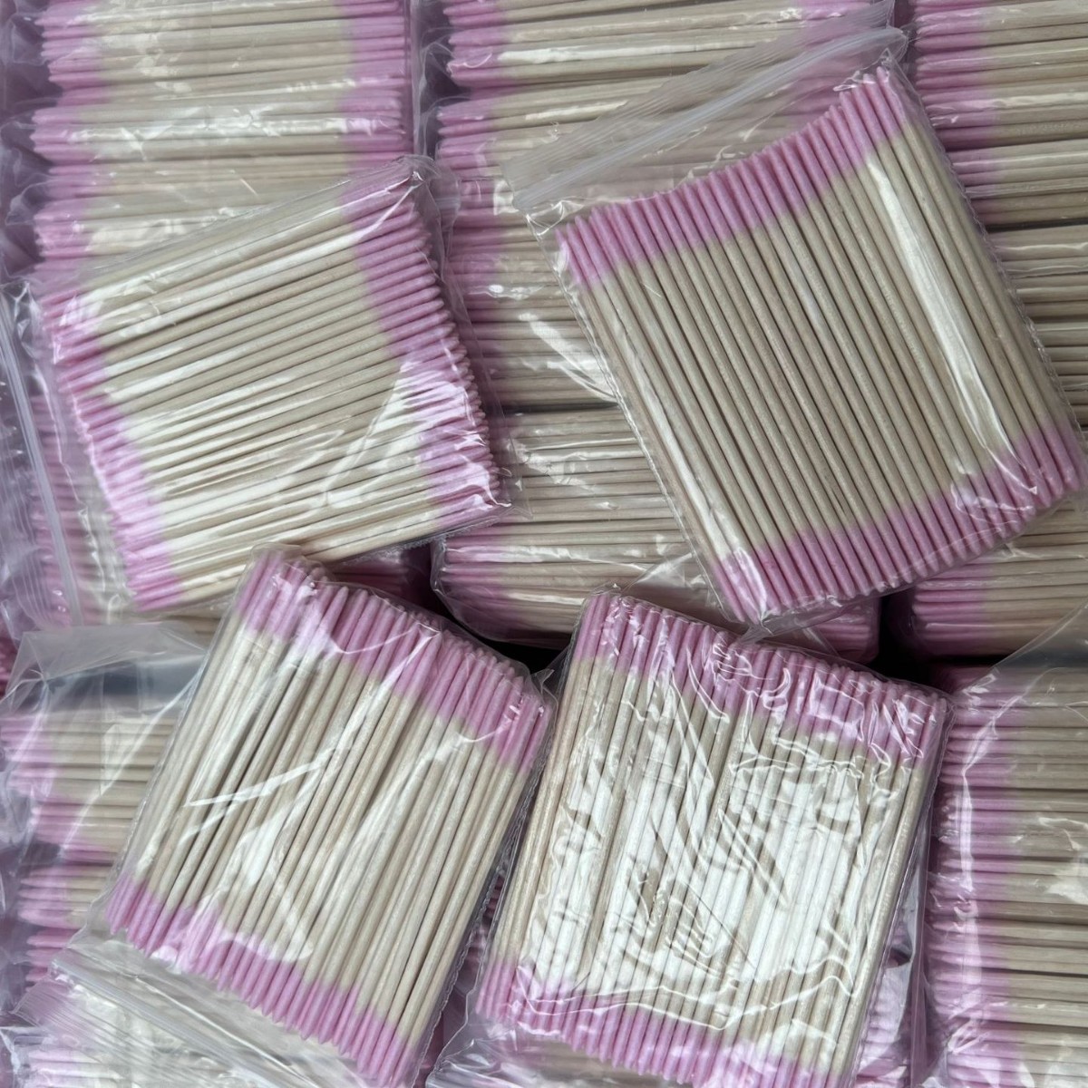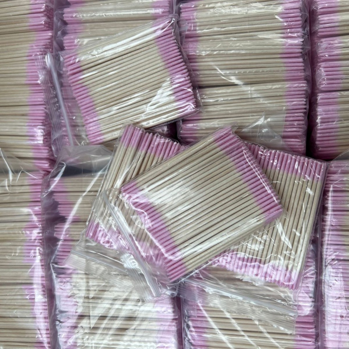 Ватный тампон розового цвета с двойным кончиком длиной 7 см.