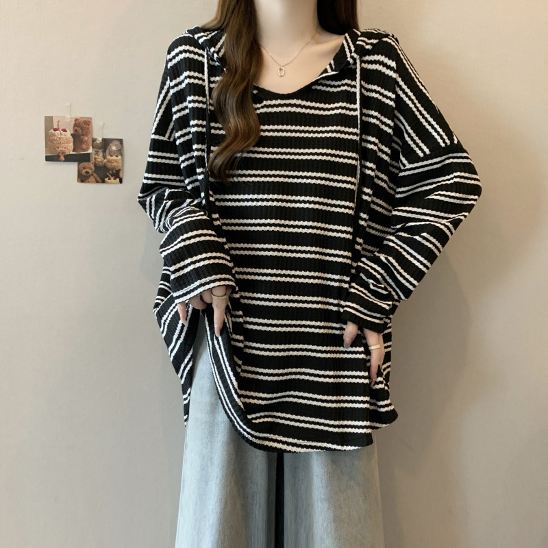 Повседневная полосатая рубашка с длинными рукавами и капюшоном для женщин размера плюс 1.0-150kg года, осенний свободный топ для похудения