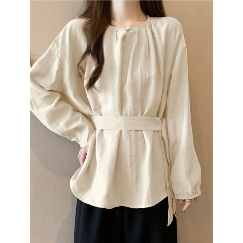 Женская рубашка-пуловер с круглым вырезом, шнуровкой на талии, французский стиль, высокое качество, однотонная, стройнящая, универсальная, осень 2025 года.